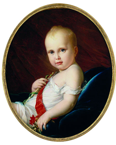 Le premier portrait est un cadeau de Marie-Louise à Napoléon qu’elle lui adresse lors de la campagne de Russie. Il le reçoit à la veille de la bataille de la Moskowa et le fait aussitôt placer devant sa tente afin de galvaniser ses soldats. Le baron Gérard, portraitiste officiel de l’Empire, représente l’enfant en héritier de l’Empire. Il tient dans sa main gauche la croix de la Légion d’honneur et dans sa main droite un sceptre. Les couleurs dominantes sont le bleu pour le fauteuil, le blanc pour son vêtement et le rouge pour le cordon qui traverse sa poitrine. Ce choix de l’artiste de reprendre les couleurs du drapeau français est très symbolique. Futur empereur, certes, mais il ne faut pas oublier que le régime napoléonien se veut une synthèse entre une forme monarchique et les acquis de la Révolution.