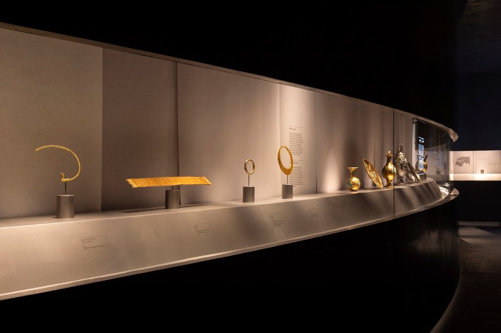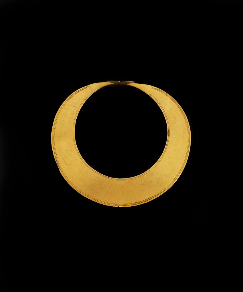 Le mot latin lunula, qui signifie « petite lune », est conventionnellement employé pour décrire des objets en forme de croissant, y compris certains bijoux en or du néolithique, du chalcolithique et, surtout, de l’âge du bronze. Ce splendide exemple est composé d’une feuille d’or plate, décorée de trois lignes incisées sur le bord extérieur et de deux sur la bordure intérieure. À chaque bout, une incision perpendiculaire marque la transition vers les extrémités, formées de spatules arrondies en saillie, tordues à 90 degrés. On retrouve des caractéristiques similaires sur d’autres lunules, provenant principalement d’Irlande (environ 80 spécimens recensés), mais aussi des zones côtières de Grande-Bretagne, de France et d’Europe occidentale. Certaines ont été mises au jour dans des tourbières, ce qui laisse penser qu’il s’agissait de dépôts rituels ; d’autres ont été découvertes sur des terrains plus élevés, parfois sous des menhirs ou dans des tombes. La comparaison avec d’autres lunules, apparemment produites entre 2200 et 2000 avant J.-C., permet de dater celle-ci du début de l’âge du bronze. (…) Portées comme ornements de cou, les lunules semblent avoir été remplacées en Irlande, à l’âge du bronze moyen, par des torques en or, puis, à l’âge du bronze final, par des collerettes d’or nervurées.