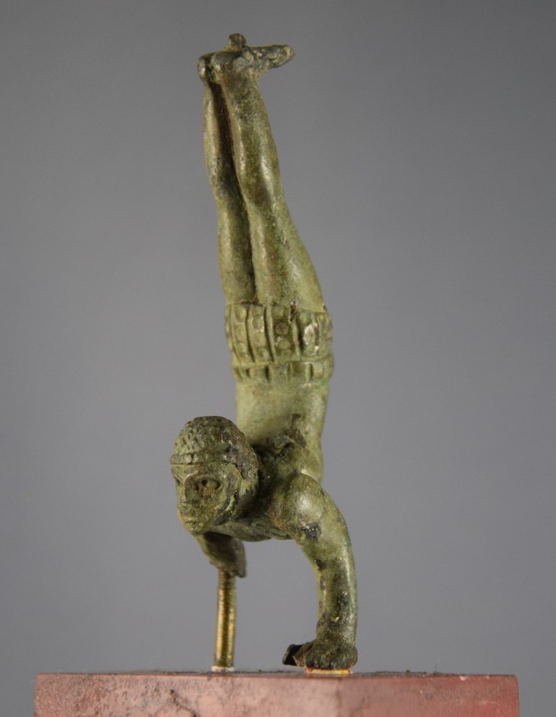 Cette petite statuette en alliage cuivreux, moulée d’une seule pièce, est un support décoratif de meuble ou d’ustensile. Les yeux, dont la pupille est en creux, étaient peut-être incrustés. Les pieds sont légèrement inclinés vers l’arrière, laissant imaginer plutôt un support de trépied ou de lampe. Un acrobate se tient en équilibre sur les mains, la tête fortement redressée et tournée vers l’extérieur. Le corps cambré, avec les pieds bien placés au-dessus de la tête, présente une musculature marquée par l’effort au niveau des épaules et des pectoraux. Les traits du visage, nez large, lèvres épaisses, semblent de type africain. L’athlète est vêtu d’un court pagne serré, remontant à l’entre-jambe pour former une sorte de culotte et sa tête est protégée d’un bonnet quadrillé muni d’une mentonnière. Il s’agit de la tenue classique des sportifs du monde romain.