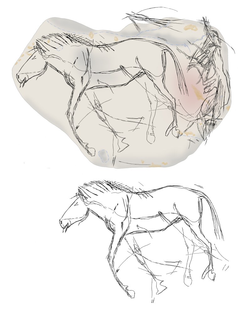L’une des faces de la pierre présente un cheval gravé, suivi d’un être imaginaire qui combine des attributs humains et animaux (voir relevé ci-dessous). De la bouche ouverte du cheval s’échappent des traits courts qui évoquent soit la langue, soit l’action de cracher ou de souffler. L’œil est dessiné comme si la paupière était fermée. Deux signes sur le flanc figurent peut-être des blessures.