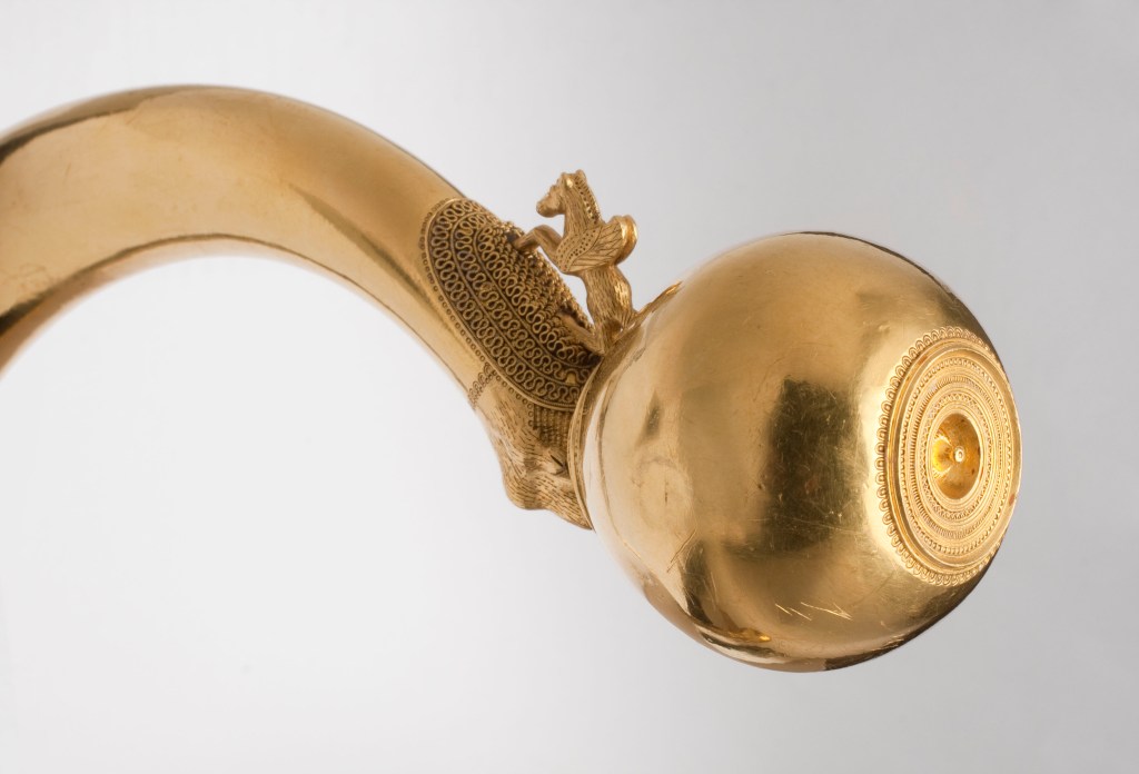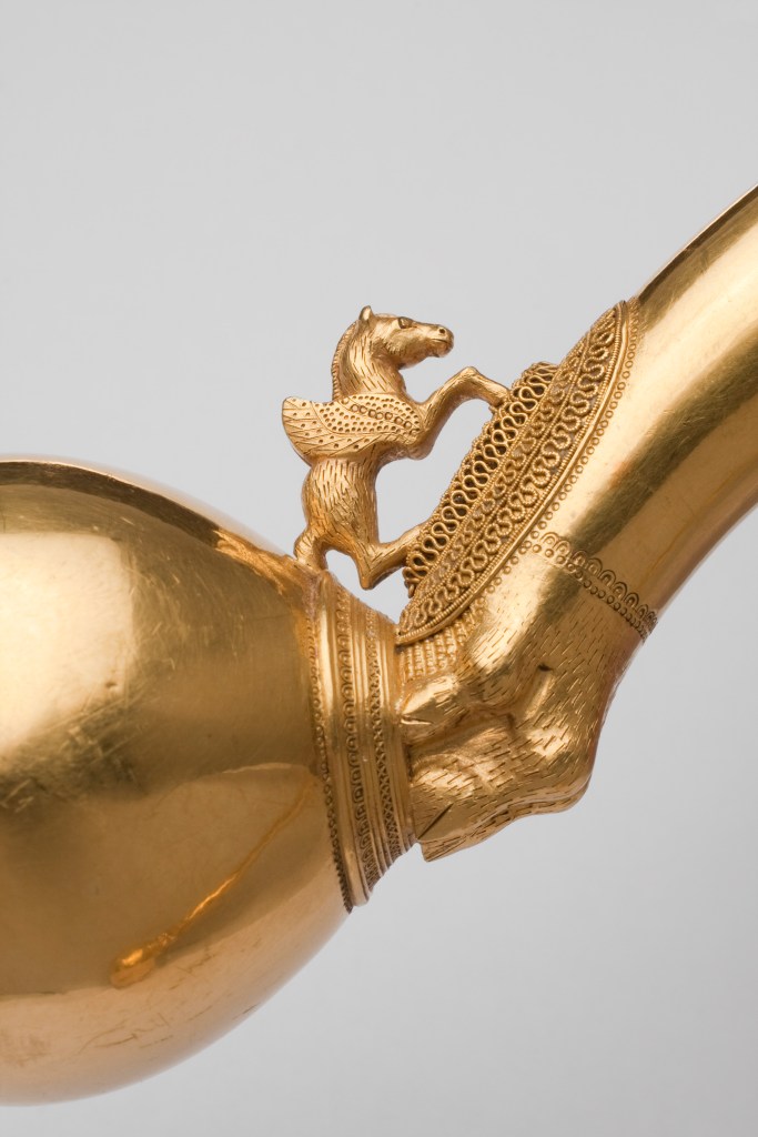 Un petit cheval ailé apparaît à la jonction des boules et de l’arc, reposant sur un coussin filigrané composé d’un réseau de fils d’or, lisses et bouletés, très finement soudés. Le cheval ailé apparaît dans la mythologie grecque sous l’identité de Pégase naissant du sang de Méduse qui, par ailleurs, est représentée sur l’anse du cratère de Vix.