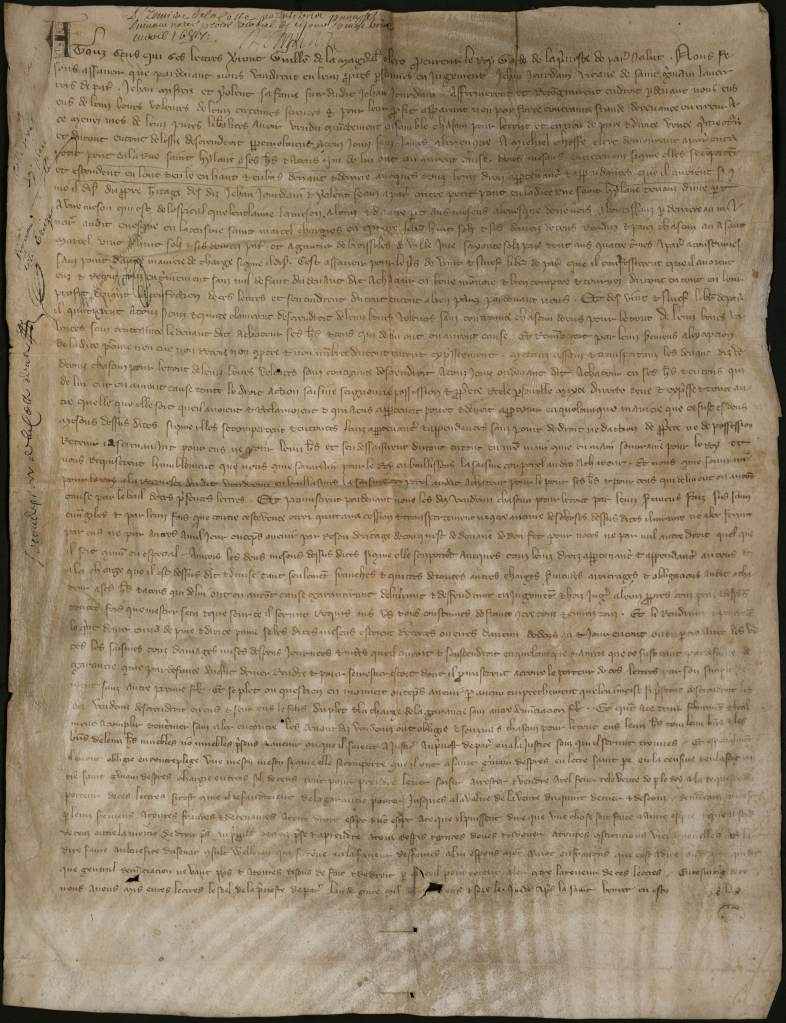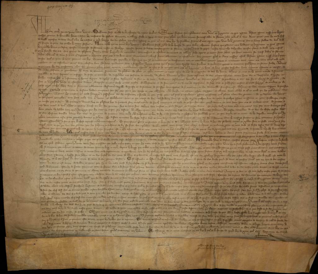 Le premier document présenté ci-dessus concerne la vente de deux maisons, rue Saint-Hilaire. Elles ont été vendues en mai 1316 par un vicaire, Jean Jourdain, et sa sœur, à un clerc, Michel Chosse. Il s’agit là de la pièce la plus ancienne de la collection. Elle fait partie du large corpus numérisé, accessible sur le catalogue en ligne, et peut être feuilletée intégralement, accompagnée de sa copie manuscrite.