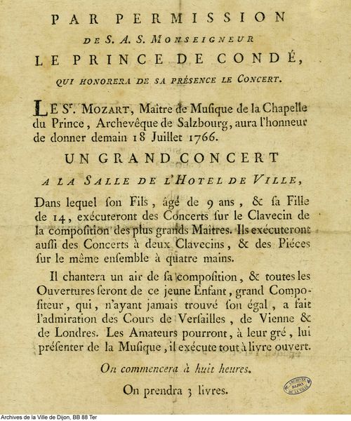 Cette affiche, rare témoignage d’un concert de jeunesse des enfants Mozart, était en possession de Pierre Brideau, greffier au tribunal de commerce de Beaune. Après son décès, elle a été donnée en 1957 par ses parents aux archives de la ville de Dijon. Signalons enfin que ce beau document à la graphie harmonieuse est en parfait état de conservation et n’a jamais du être apposé sur un mur ou une porte.