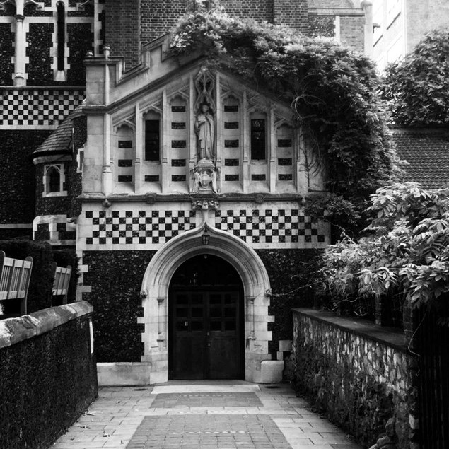 Cette entrée (photographie de gauche) est marquée sur Smithfield par un charmant bâtiment à pan de bois, datant peut-être de l’époque des dominicains de Marie Tudor, peut-être des années qui suivirent. Ce bâtiment du XVIe siècle laisse apercevoir l’arche du XIIIe siècle, qui était peut-être l’une des portes de l’église. Entre cette arche et la nouvelle porte de l’église, on suit le tracé de l’ancien bas-côté Sud de la nef (photographie du milieu). Sous l’arche le blason aux deux léopards couronnés évoque les anciennes armoiries des ducs de Normandie et leur double souveraineté sur l’Angleterre et la Normandie, et rappellent donc l’origine normande de cette église. Plus tard, le troisième léopard, celui du duché d’Aquitaine de l’époque angevine, permettra de former le blason du royaume d’Angleterre. Au bout du chemin, on accède à l’entrée principale de l’église (photographie de droite). Surmontée par la statue de l’apôtre Barthélemy, elle donne accès au transept Sud. St Bartholomew-the-Great a, en effet, la particularité d’être toujours constituée uniquement d’un narthex (première travée de la nef), d’un transept et d’un chœur, entouré d’un déambulatoire et prolongé par une chapelle Notre-Dame. La nef n’a jamais été reconstruite.