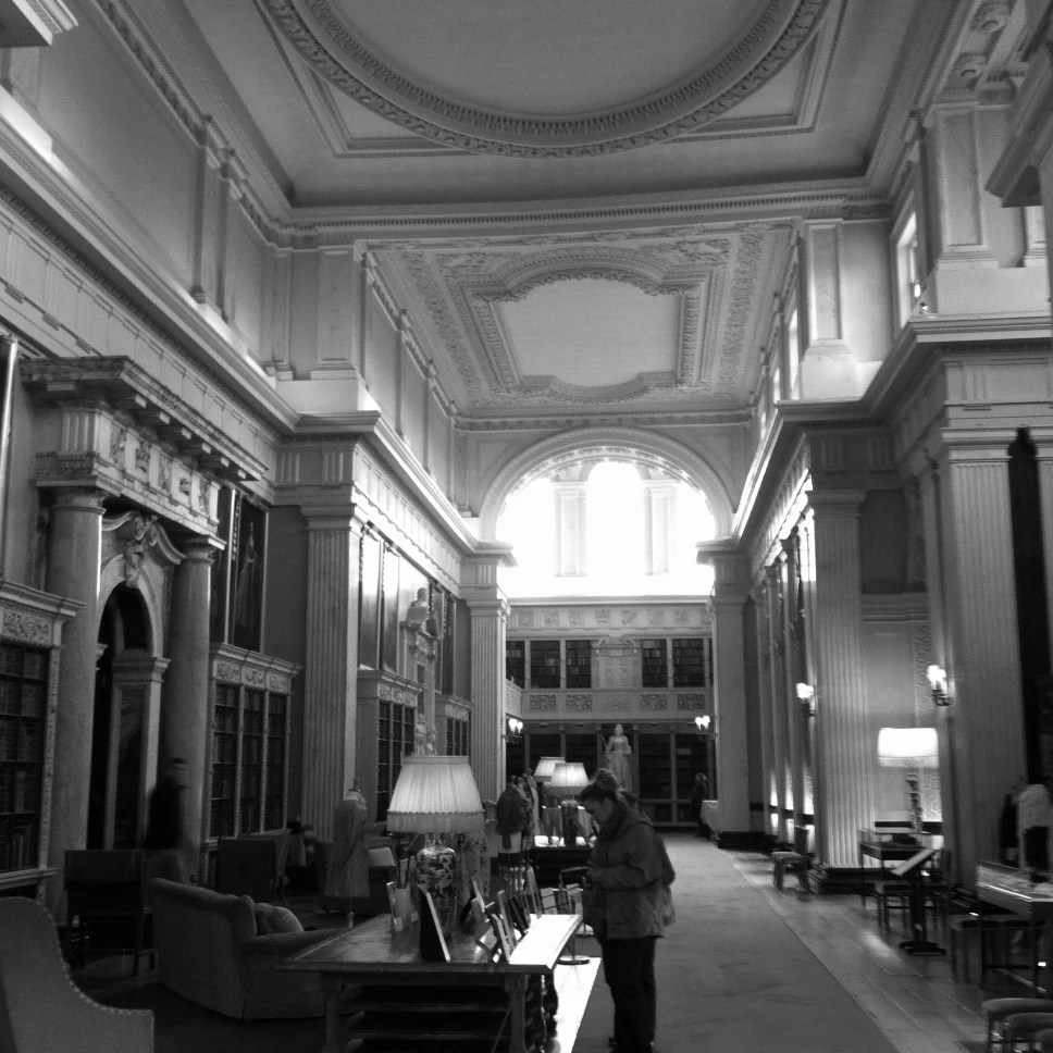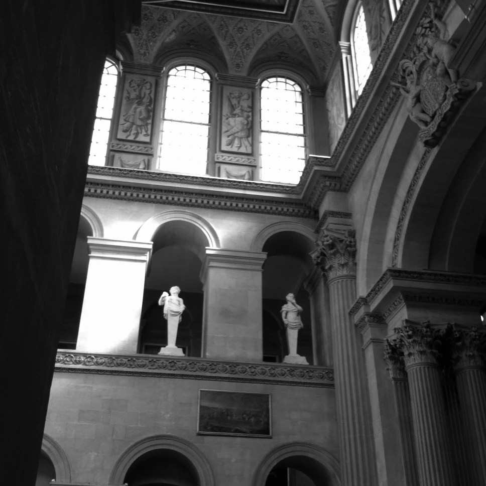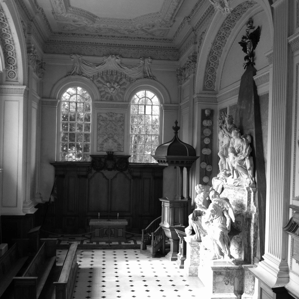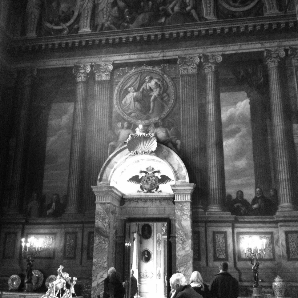 Dans l’enfilade de la cour, du pont et de la colonne, on trouve, à l’intérieur du palais proprement dit, un gigantesque vestibule d’entrée (photographie en haut à droite) et le salon central. Les murs du vestibule sont ornés de sculptures de Grinling Gibbons et la fresque du plafond, peinte par James Thornhill (Painted Hall de l’actuel Old Royal Naval College, intérieur du dôme de Saint-Paul, Chatsworth House) culmine à 20 mètres. Elle représente John Churchill s’agenouillant aux pieds de Britannia pour lui présenter les plans de la bataille de Blenheim. Quand au salon central, à l’italienne, il est orné de fresques en trompe-l’œil du Français Louis Laguerre (photographie au centre à gauche). Son plafond représente le Triomphe du duc de Marlborough. De part et d’autre du salon, des appartements alignent leurs vastes pièces sur plusieurs dizaines de mètres (photographie au centre au milieu). L’aile est abrite les appartements privés (photographie au centre à droite) et l’aile ouest une vaste galerie de peintures de 55 mètres de long, imaginée par Hawksmoor et transformée plus tard en bibliothèque (photographie en bas à gauche). On y trouve le plus grand orgue privé d’Europe (entendez : appartenant à un individu et non à une institution).