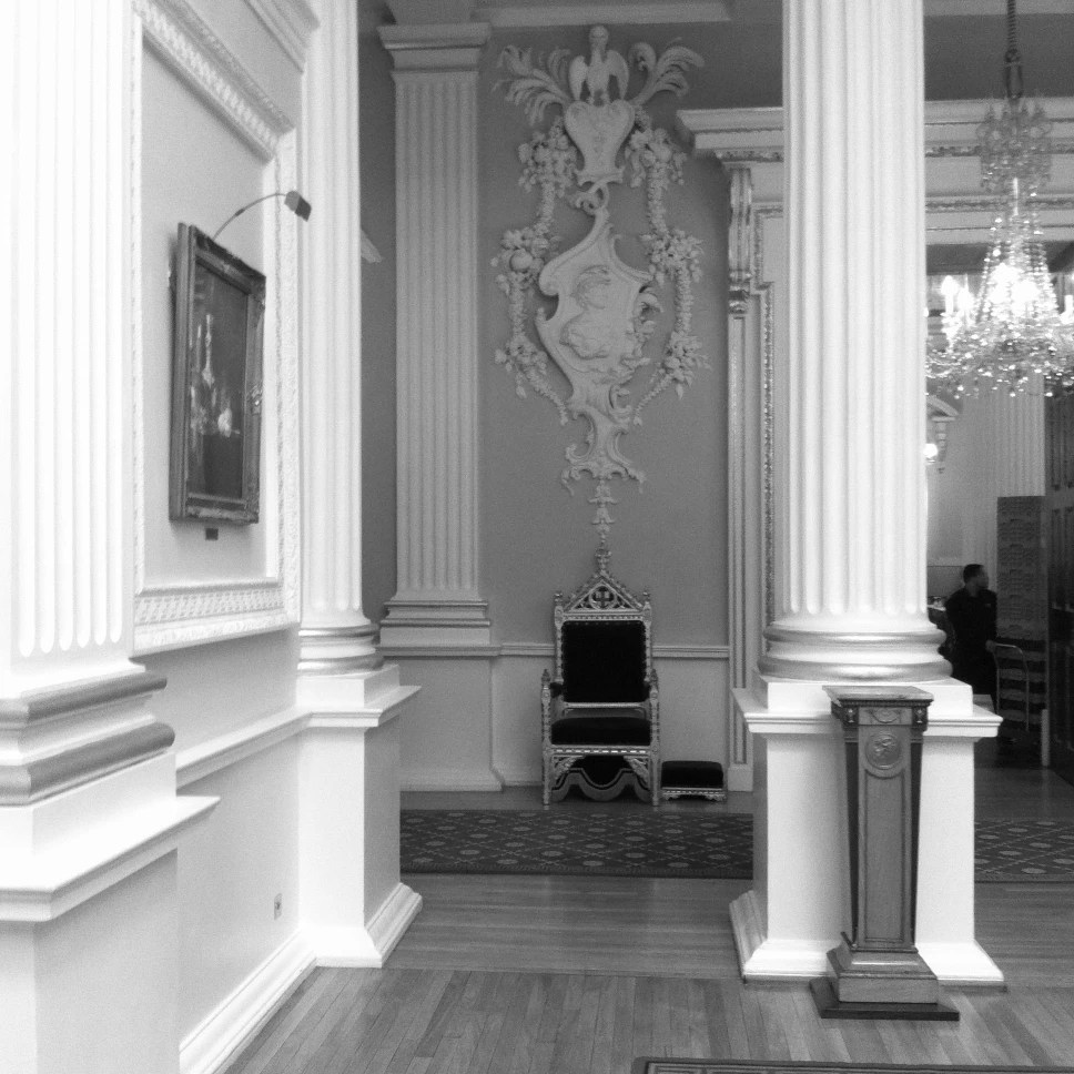 En passant sur Walbrook, on tombe sur la façade latérale Ouest. Au premier étage, la fenêtre de style palladien est celle du Salon vénitien (Venetian Parlour), qui est le bureau du Lord Mayor. Au-dessus se trouve l’immense baie vitrée de la Salle de bal (Ballroom ou Dancing Gallery), qui court sur toute la largeur du bâtiment (ou de sa profondeur, quand on est sur Walbrook). Comme nous l’avons dit, Mansion House disposait de deux étages nobles au XVIIIe siècle. Si le premier étage était essentiellement destiné aux cérémonies protocolaires, le second servait quant à lui aux réceptions plus mondaines. Ainsi, par exemple, quand ces messieurs de la Cité festoyaient avec le Lord Mayor dans la salle de banquet du premier étage, leurs épouses rejoignaient la Lady Mayoress au deuxième étage, pour prendre des rafraichissements, s’amuser et danser. Elles pouvaient également surveiller leurs maris depuis la galerie de la salle des banquets. A la fin du XVIIIe siècle, les comportements sociaux ont changé et le deuxième étage est devenu plus privé. Au fil du temps, la Salle de bal a perdu son usage initial et, aujourd’hui, elle n’est qu’une luxueuse galerie de communication pour accéder aux différents espaces de l’étage.