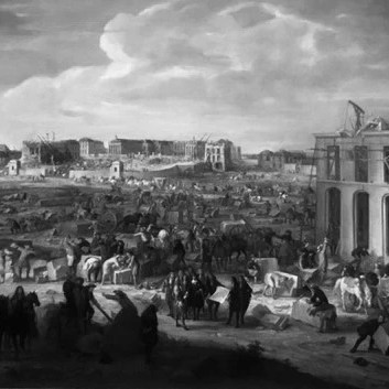 On connaît surtout Adam-François van der Meulen pour ses scènes militaires, représentant Louis XIV à Besançon, Arras ou Tournai. Mais, avec quelques autres peintures que nous diront civiles, il est aussi l’auteur d’un tableau fort connu pour quiconque s’intéresse au château de Versailles : La construction de Versailles (The Building of Versailles). Vers 1680, l’enveloppe du vieux pavillon de chasse de Louis XIII est déjà en place, mais les ailes du Nord et du Midi sont encore absentes. Ici, on voit des milliers d’ouvriers en train d’aménager les ailes des Ministres, la cour d’Honneur et la place d’Armes, peut-être aussi la Petite écurie, au premier plan. A proximité, on devine Louis XIV à qui Jean-Baptiste Colbert et Jules Hardouin-Mansart sont en train de présenter les plans du château. Le château de Versailles, les deux autres personnages dont nous souhaitons parler ici l’ont bien connu.
