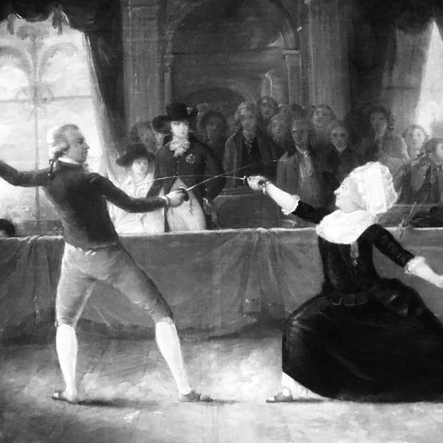 Le premier est Charles-Geneviève d’Eon de Beaumont, né à Tonnerre en 1728. Tour à tour militaire, diplomate et espion, le chevalier d’Eon défrayera la chronique des cours européennes puisqu’il vivait et s’habillait comme une femme. Celui qui fut la lectrice de l’impératrice Elisabeth à Saint-Pétersbourg fut aussi un valeureux soldat sur les champs de bataille de la guerre de Sept-Ans. Il fut ainsi décoré par Louis XV du prestigieux ordre royal et militaire de Saint-Louis, avant de rentrer dans son service de diplomatie parallèle, le fameux Secret du Roi. Les décennies qu’il passa ensuite à Londres furent rocambolesques, entre service du roi et trahison, préparant l’invasion de la Grande-Bretagne ou faisant chanter Louis XVI. Ajoutez à cela la du Barry et Beaumarchais, des milliers de personnes pariant sur son sexe et son activité de bretteur, et vous obtiendrez l’un des personnages les plus délicieusement décadent du XVIIIe siècle européen, à la hauteur d’un Casanova ou d’un Cagliostro. Sur le tableau présenté à l’exposition, c’est justement son dernier gagne-pain qui est représenté. Alors qu’il avait été désavoué par Louis XVI et avait perdu ses charges et rentes, il ne trouva d’autre moyen de subsistance que de donner des « spectacles » d’escrime. Le 9 avril 1787, il fut ainsi invité par le prince de Galles à Carlton House, pour une démonstration de bottes et de touches avec un autre escrimeur professionnel, un autre Français, guadeloupéen celui-là, le chevalier de Saint-Georges. Et notre Charles-Geneviève de se battre, en robe noire et bonnet à dentelle, l’ordre de Saint-Louis épinglé au sein. Il mourut à Londres, dans la misère, le 21 mai 1801, à l’âge de 81 ans, et fut enterré, comme tant d’autres Emigrés, dans le vieux cimetière de Saint-Pancras. Ironie de l’histoire pour ce personnage au genre incertain : Londres relevait alors du comté du Middlesex !