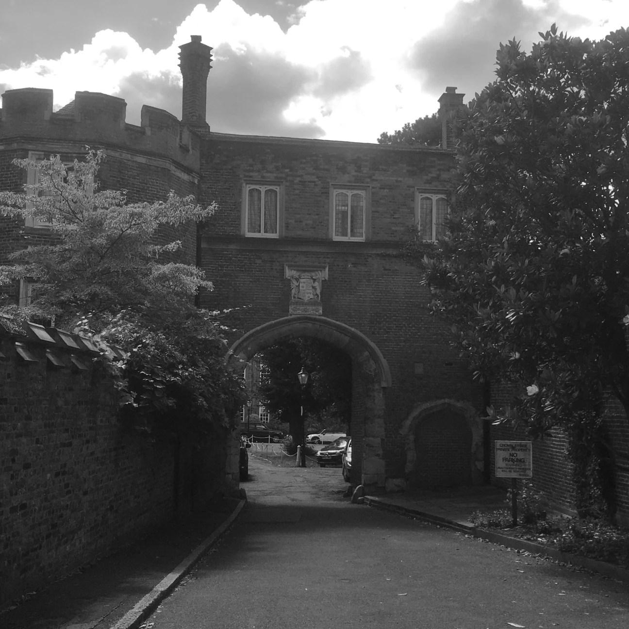 Depuis the Green, on y accède par une ancienne porte de style Tudor, flanquée d’une tour crénelée (photographie de gauche). Un panneau nous indique que l’ensemble appartient au Domaine de la Couronne (Crown Estate) et une plaque nous rappelle qu’il s’agit du palais de Richmond, résidence d’Henri VII, Henri VIII et Elisabeth Iere.