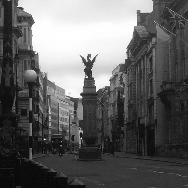 Quant à la frontière entre les cités de Londres et de Westminster, elle fut marquée dès 1880 par le Temple Bar Memorial, le monument dont nous parlions au début de cet article. Le piédestal, orné des attributs des arts, des sciences, de la navigation et autres réalisations humaines, présente deux statues en bronze de la reine Victoria et de son fils, alors prince de Galles. Cela rappelle que la souveraine a été la dernière à franchir Temple Bar Gate, en 1872, lorsque la famille royale était venue assister à un service d’action de grâce à la cathédrale Saint-Paul, pour célébrer la guérison du futur Edouard VII, après une grave attaque de fièvre typhoïde. La scène est d’ailleurs représentée sur un des bas-reliefs. Au sommet, un dragon, l’un des emblèmes héraldiques de la cité de Londres, semble protéger la ville. C’est l’un des treize dragons qui, depuis la fin des années 1960, marquent quelques-unes des entrées de la Cité de Londres. Les deux dragons de Victoria Embankment sont plus anciens puisqu’ils ornaient le vieux Coal Exchange dès 1849. Les onze autres sont des versions réduites de ces derniers, fondues dans les années 1960.