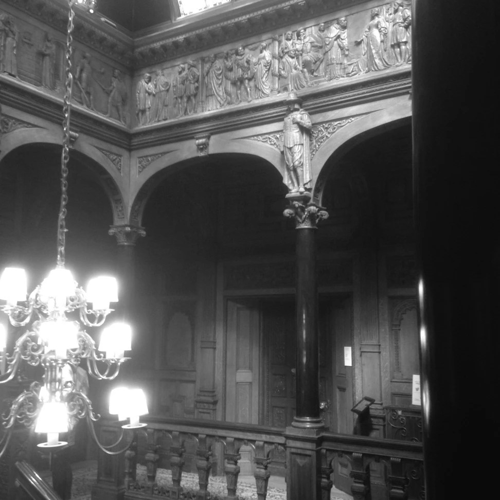 Dans la somptueuse cage d’escalier, située au centre du bâtiment et éclairée par une verrière en vitrail, le sculpteur Thomas Nicholls a ainsi représenté les héros des romans préférés du milliardaire : sur les rampes de l’escalier, Athos, Porthos, Aramis et D’Artagnan montent la garde avec Milady, Constance Bonacieux et Bazin, le fidèle valet d’Aramis (Les Trois Mousquetaires d’Alexandre Dumas, 1844)) ; en haut des colonnes de l’étage, Rip Van Winkle (personnage du roman éponyme de Washington Irving, 1819) est aux côtés des protagonistes du Dernier des Mohicans (James Fenimore Cooper, 1826) et de La Lettre écarlate (Nathaniel Hawthorne, 1850) ; dans la frise située sous la verrière, 82 figures sont tirées de l’œuvre de William Shakespeare (photographie du milieu)