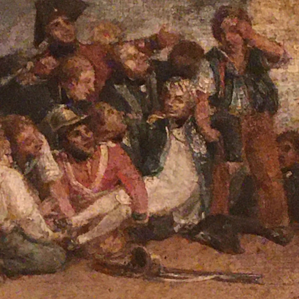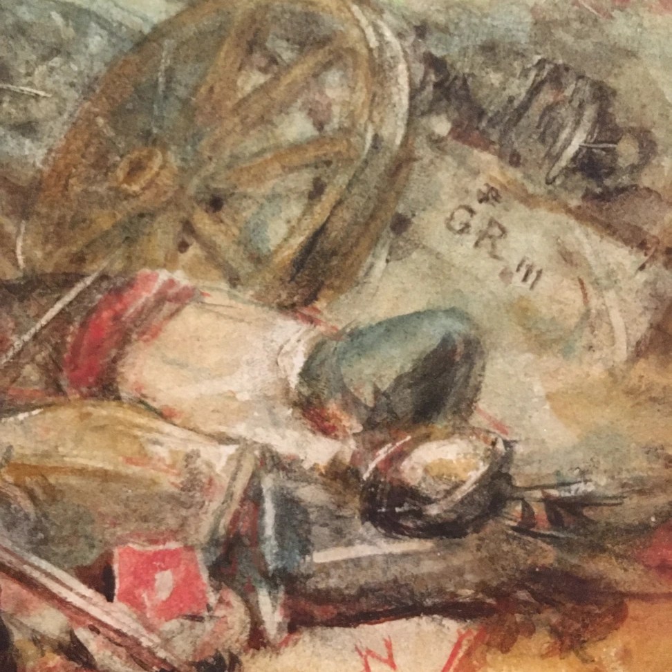 L’autre grande moment, c’est bien sûr Waterloo (18 juin 1815). Mais en dix ans, l’art de Turner a évolué, ainsi que son tempérament. Dans l’audioguide, les commissaires expliquent qu’il est passé du patriotisme à une forme d’humanisme. Dans son tableau (The Field of Waterloo, exp. 1818), il ne représente pas la bataille, mais ses conséquences : les milliers de morts et de blessés qui jonchent le champ de bataille, au lendemain de la victoire de la Coalition. On voit des femmes, dont on ne sait si elles sont venus chercher un mari manquant à l’appel ou piller les cadavres des pauvres soldats. L’humanisme de Turner, on le retrouve aussi dans certains détails (photographie du milieu). Au milieu des canons, on devine les monogrammes des souverains : le N de Napoléon et le GRIII de Georges III (George Rex III). Mais, après tout, il n’y a plus vraiment de Français ni d’Anglais, il n’y a que des morts.