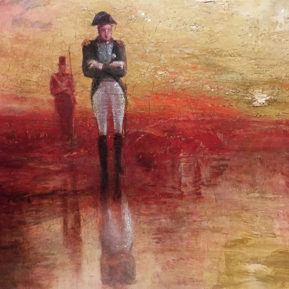 L’exposition se termine sur un tableau énigmatique (War – The Exile and the Rock Limpet, exp. 1842). L’Empereur, déchu, est à Sainte-Hélène (photographie de droite). Sous la surveillance d’un soldat britannique, il est au milieu d’une promenade sur cette ile perdue au milieu de l’Atlantique Sud. Il observe un mollusque. A moins que ce ne soit son reflet dans l’eau (reflet de ce qu’il a été ?). A moins qu’il ne soit perdu dans ses pensées. A moins qu’il ne réfléchisse à une nouvelle évasion. Au fond, le soleil couchant remplit l’horizon d’une intense couleur rouge. Turner dira que c’était une manière d’évoquer le sang que Napoléon avait fait couler.