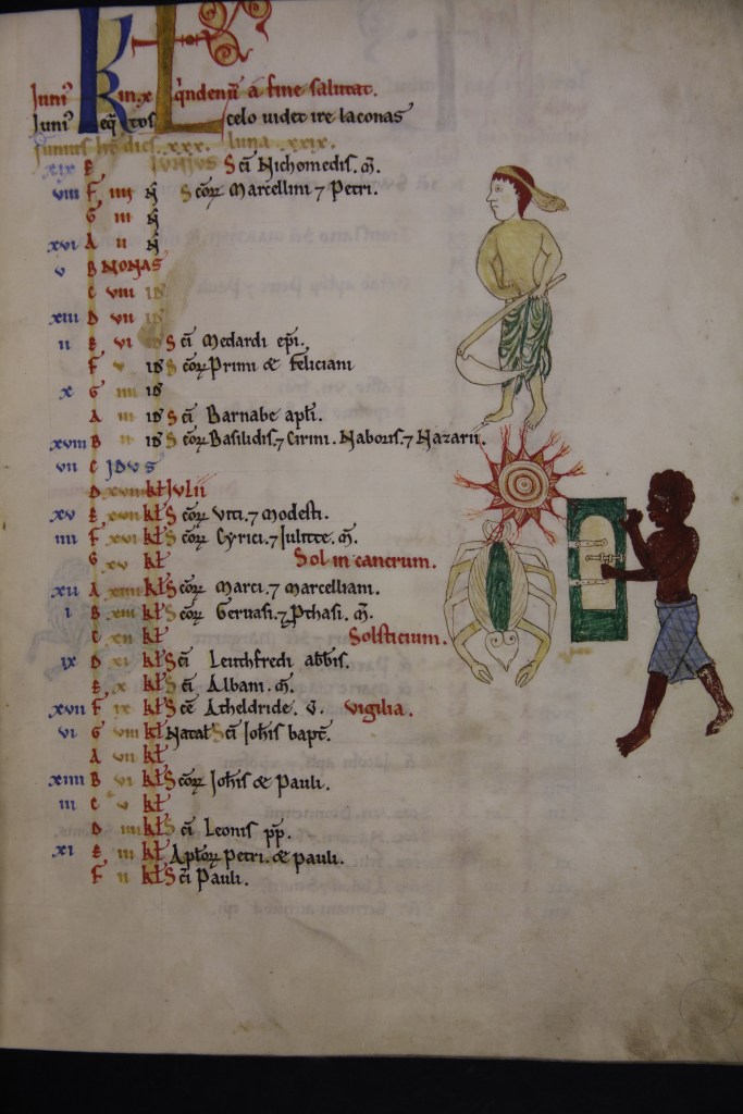 Le psautier de Lunel a néanmoins une particularité qui passionne les chercheurs. Parmi les scènes du calendrier, il en est une exceptionnelle et unique dans l’iconographie médiévale : une porte, un homme noir en train de toucher la serrure de la porte, et un soleil au-dessus (ill. 2). Elle est reproduite deux fois pour les mois de juin et décembre. Christian Heck, ancien conservateur du musée d’Unterlinden de Colmar, nous suggère une interprétation : ces scènes auraient été peintes plus tard lorsque le psautier se trouvait à Saint-Guilhem-le-Désert, aux portes de l’Espagne. Nous serions face à une illustration des « portes du soleil » situées aux tropiques du Cancer et du Capricorne, marquant le cheminement des âmes entre terre et ciel. Figures énigmatiques et originales, les hommes noirs seraient les gardiens de ces portes.
