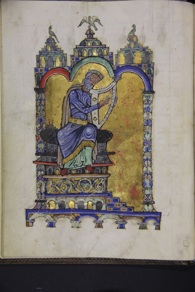 Un psautier est un recueil de psaumes (textes poétiques) contenus dans l’Ancien Testament. Ces psaumes sont attribués au roi David. Sur une enluminure de pleine page, c’est lui qui est représenté jouant de la harpe dans un décor architectural (ill. 1).