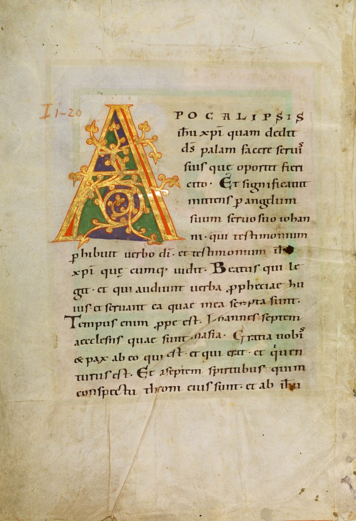 Apocalypse de Bamberg, Staatsbibliothek Bamberg, Ms. Bibl.140, f. 1 v. avec initiale A,