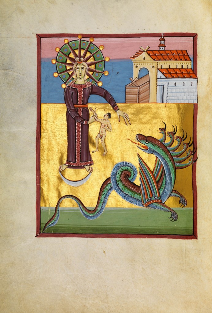 L’ouverture des autres sceaux et le son des sept trompettes provoquent des catastrophes sur terre, aboutissant à l’apparition d’un dragon. Il s’attaque à un enfant, né d’une femme debout sur un croissant de lune et portant une couronne d’étoiles. Dans la tradition médiévale, elle symbolise l’Église (mater ecclesia), qui est attaquée par les puissances terrestres. L’archange Michel et son assistant combattent le dragon (voir l’enluminure). Finalement, les guerriers de l’armée céleste sont victorieux contre le dragon et son double, le faux prophète, et les jettent dans une mare de flammes. Le dragon doit y reposer pendant le règne millénaire du Christ et de ses fidèles, jusqu’à ce qu’il soit à nouveau libéré.