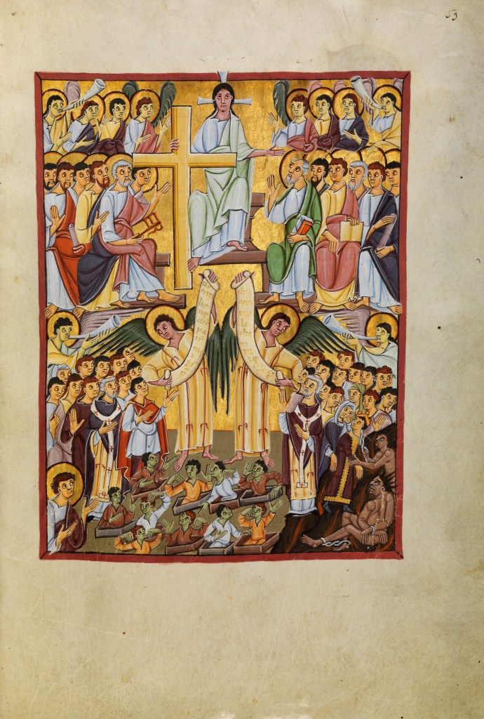 La bataille finale, au cours de laquelle le dragon est finalement vaincu, est suivie du Jugement dernier : le Christ sépare les justes des damnés et crée un nouveau ciel et une nouvelle terre. Cette représentation, familière grâce à de nombreuses reproductions dans des images et sculptures médiévales, a été conçue pour la première fois par les artistes de Reichenau qui ont décoré l’Apocalypse de Bamberg.