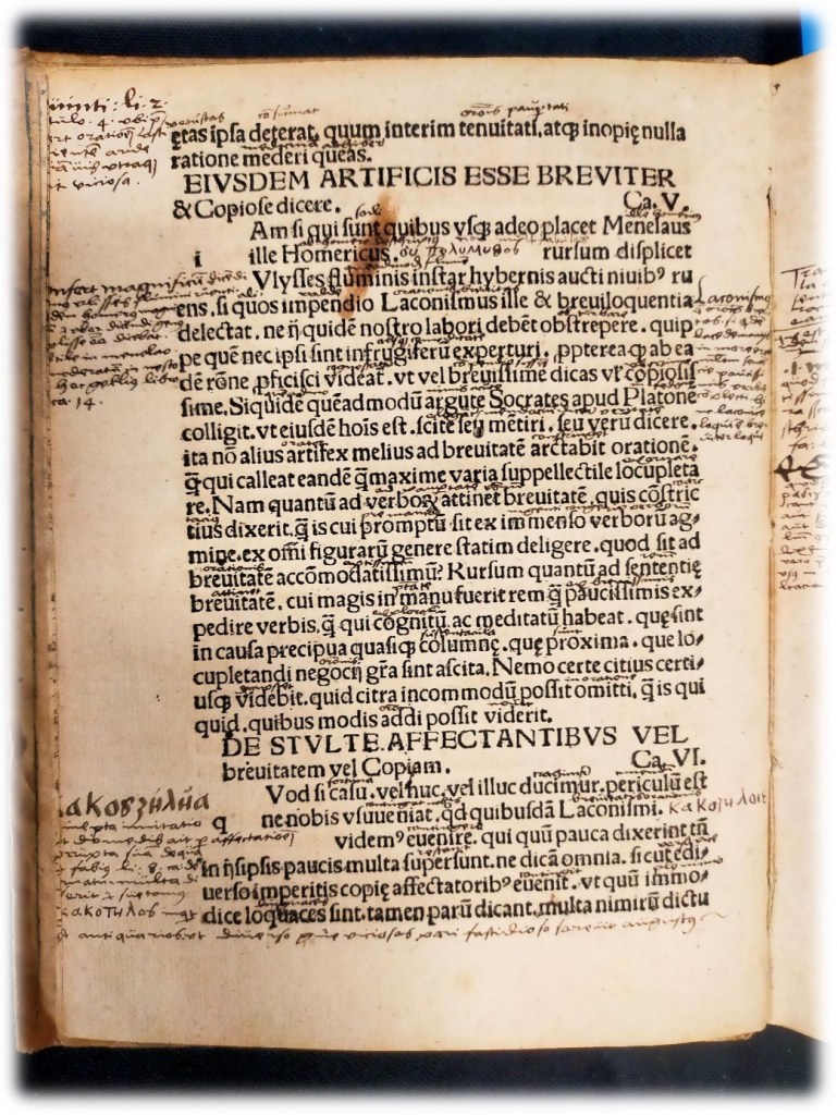 La première partie du recueil a été largement utilisée, comme en témoignent les très nombreuses annotations manuscrites qui parsèment, entourent et accompagnent le texte. Certaines se combinent avec le texte : le discours imprimé possède en effet des blancs par endroits, là où devaient figurer des mots en grec ancien. Or l’imprimeur ne disposait pas de ce jeu de caractère lors de l’impression : il fallait donc qu’ils soient rajoutés manuscritement. L’auteur des ajouts manuscrits en a profité pour expliciter certain de ces mots grecs en latin, à côté ou à la marge.