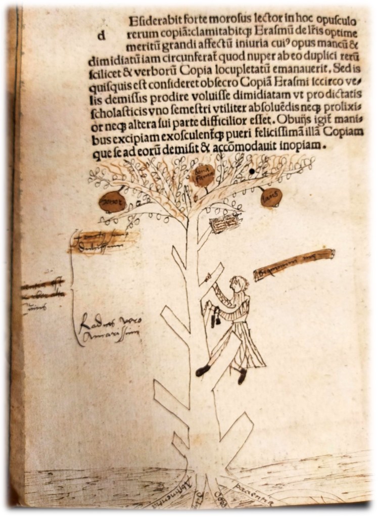 Le premier ouvrage, De verborum copia, est publié une première fois en 1512 puis remanié et augmenté pendant une vingtaine d’années par son auteur. Érasme y donne ici un exposé pratique sur la manière de la rhétorique (verborum).