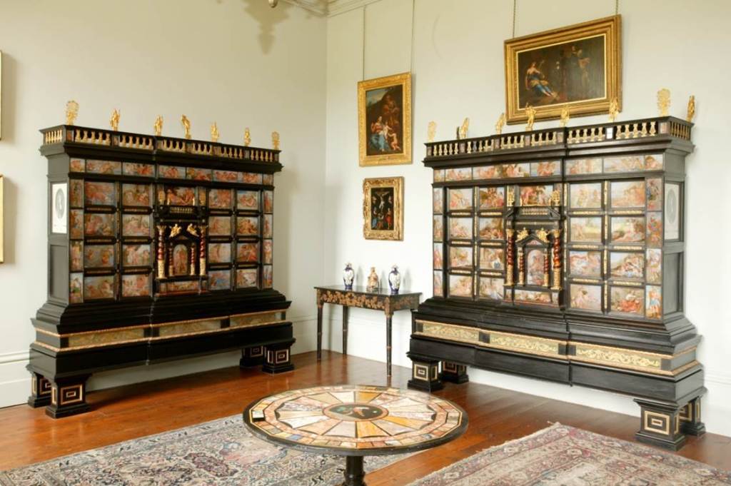 Les deux grands cabinets napolitains, achetés par sir Thomas Isham pendant son séjour à Naples en 1677, sont parfaitement représentatifs d’une forme d’artisanat propre à cette région. En effet, l’utilisation de panneaux de verre peints à l’envers est une technique décorative très appréciée par les ateliers d’ébénisterie napolitains. Qui plus est, par leur dimension impressionnante, les cabinets de Lamport Hall occupent une place à part dans l’histoire de ce type de mobilier.