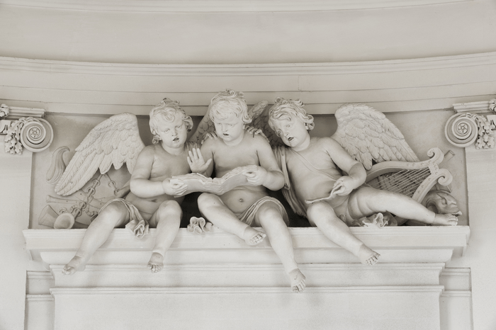 Le deuxième groupe illustre l’aspect festif et réceptif du château, avec des putti chanteurs entourés de partitions et d’instruments de musique.