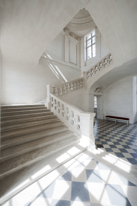Avec son vide central, il s’élève en quatre volées de marches, suspendues comme par magie, offrant une sensation de légèreté et de grâce. Sa coupole ovale, invisible depuis la cour d’honneur, ajoute à son mystère et à son charme.