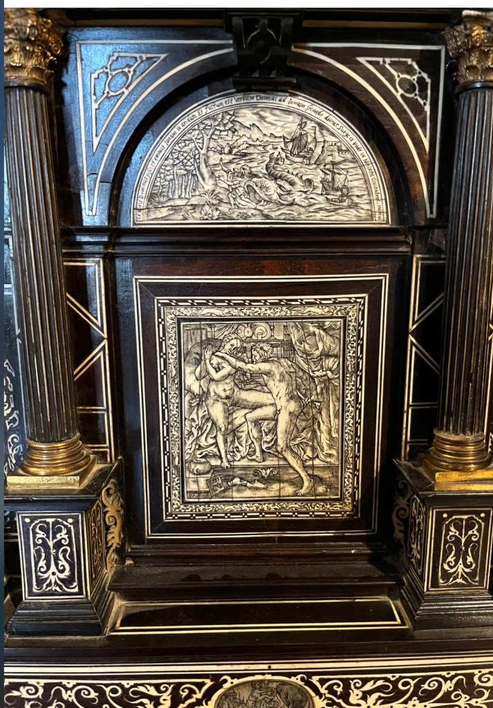 L’intérieur des grandes portes du cabinet présente le même type de décor architecturé. Ces décors permettent d’attirer le regard sur deux petites plaques en ivoire gravé, surmontées chacune par une plaque d’ivoire cintrée, qui comporte aussi un décor. À droite est représenté Leda et le cygne. Cette copie de la gravure de Heinrich Aldegrever, réalisée en 1550, fut beaucoup diffusée. Elle appartient à la série des Travaux d’Hercule. En effet, dans un couffin, l’enfant Hercule lutte contre les deux serpents que Junon lui a envoyés pour le tuer. La nôtre est datée et signée « 1593 CW ». À gauche, il s’agit toujours d’une copie d’Aldegrever, mais d’un sujet plus rare, issu d’une série de trois gravures représentant l’histoire de Lucrèce. Nous pouvons y voir Tarquin prêt à tuer Lucrèce avec son couteau. Une grande violence sexuelle apparait dans cette représentation. Elle aussi est datée et signée « 1593 CW ». Au-dessus de ces deux gravures, se trouvent des plaques non datées et non signées, issues de l’histoire de Jonas et de la baleine. Le cabinet comporte d’autre petits tableaux gravés sur ivoire ou sur nacre. L’ensemble de l’iconographie fait penser à un thème moralisateur, sur la vertu et la confiance en Dieu.