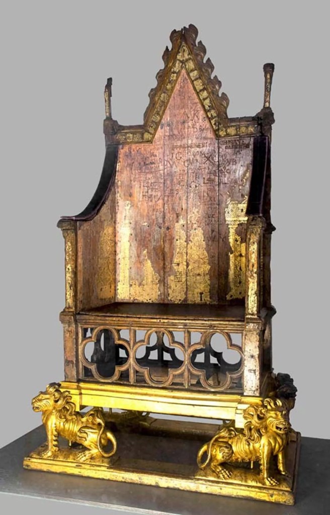 The Coronation Chair was made by order of Edward I to enclose the famous Stone of Scone, which he brought from Scotland to the Abbey in 1296, where he placed it in the care of the Abbot of Westminster. The King had a magnificent oaken chair made to contain the Stone in 1300-1301, painted by Master Walter and decorated with patterns of birds, foliage and animals on a gilt ground (the first idea was for a bronze chair to be made but that was deemed too expensive). The figure of a king, either Edward the Confessor or Edward I, his feet resting on a lion, was painted on the back. The four gilt lions below were made in 1727 to replace the originals, which were themselves not added to the Chair until the early 16th century. The Stone was originally totally enclosed under the seat but over the centuries the wooden decoration had been torn away from the front.