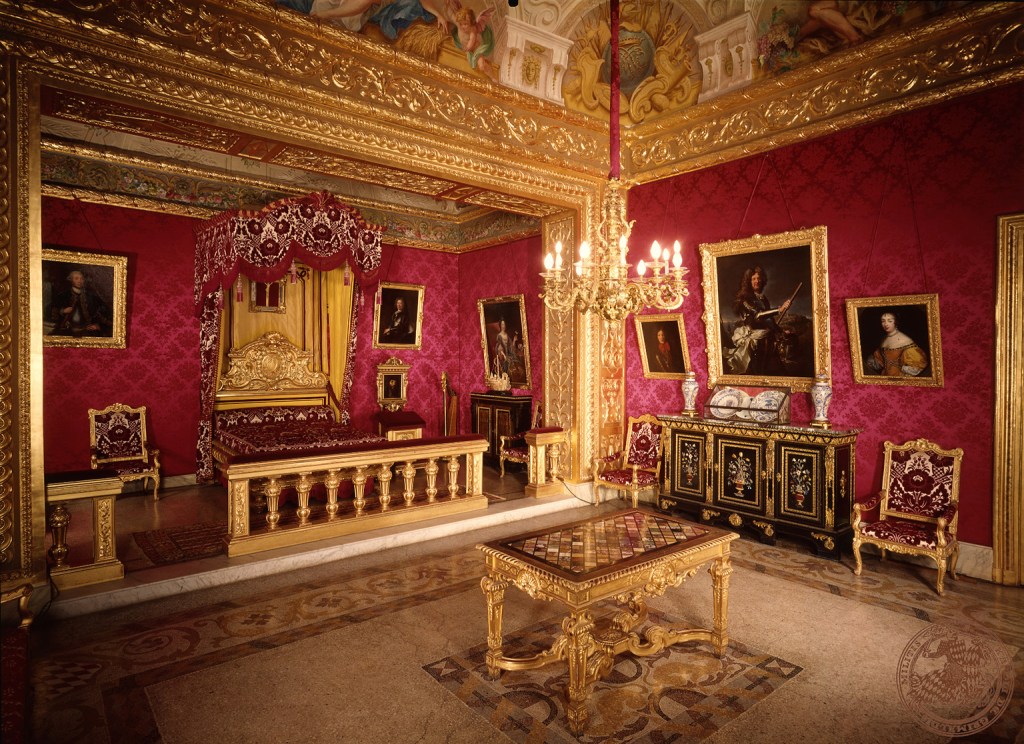 Comme dans la plupart des résidences princières, un appartement du palais de Monaco est réservé aux hôtes de marque de rang royal. On parle donc de quartier royal, d’antichambre et de chambre royale. Elle apparait aussi sous le nom de Chambre à l’alcôve dorée, à cause de son somptueux décor, conçu certainement vers 1688, à l’époque du mariage du futur prince Antoine Ier avec Marie de Lorraine, lorsqu’ils reçoivent, dans l’étiquette de Versailles, le rang de prince étranger. Le duc d’York pousse son dernier soupir sous le regard de la Renommée, qui porte l’écu des Grimaldi, mais aussi de Junon, qui trône au-dessus du baldaquin. L’ensemble a été peint par des maîtres italiens et restauré au XIXe siècle. Très vite, cette pièce va être valorisée par le nom de l’illustre qui y est mort. Ce fait est ainsi signalé au voyageur Sulzer, qui découvre le palais en 1775.