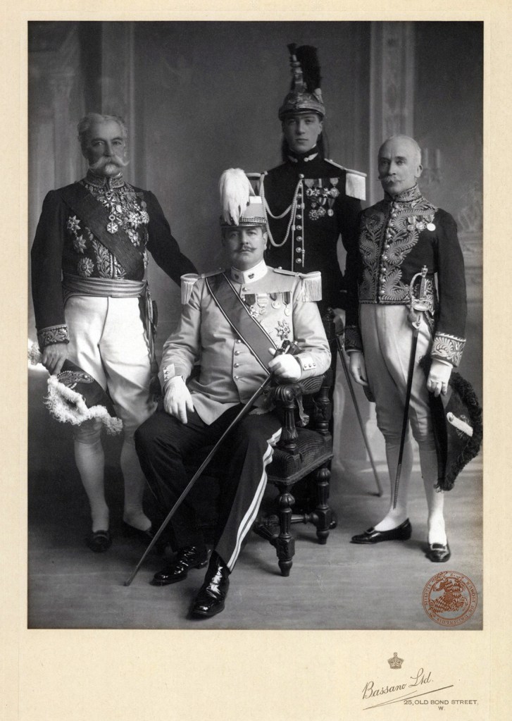 Le prince est entouré (de gauche à droite) du comte Fernand Balny d’Avricourt (1844-1930), envoyé extraordinaire et ministre plénipotentiaire de Monaco près du président de la République française, de Robert Balny d’Avricourt (1886-1961), capitaine du 11e régiment de cuirassiers, et du comte Henri de Maleville (1870-1955), envoyé extraordinaire et ministre plénipotentiaire de Monaco en Italie.