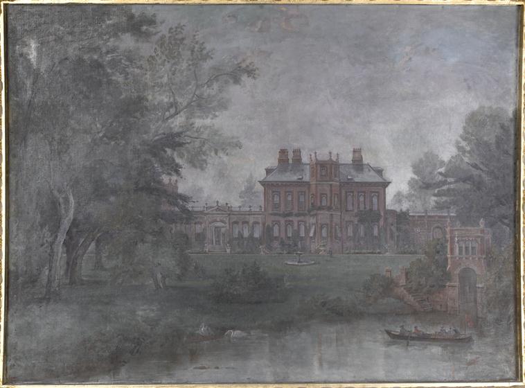 Cette vue est antérieure à l’exil du duc d’Aumale mais elle permet de donner une idée de l’image d’Orleans House lors de son acquisition par celui-ci en 1852. On peut y voir les rives de la Tamise, la demeure principale reliée par le link à l’Octogone, ce dernier étant toujours conservé.