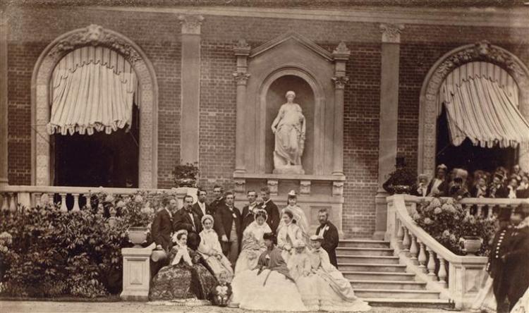 Il s’agit d’une des rares photographies prises à Orleans House au temps du duc d’Aumale. Le groupe se tient devant la bibliothèque construite par Félix Duban pour le duc, qui a aujourd’hui disparu. Le duc avait une idée bien précise de cet édifice dont il donna des instructions précises à Duban, malheureusement aucune vue intérieure n’en est conservée. Cela rappelle que durant l’exil le duc devint un bibliophile passionné et commença aussi ses premières études historiques. Elle l’inspira ensuite très probablement pour la création du Cabinet des Livres à Chantilly.