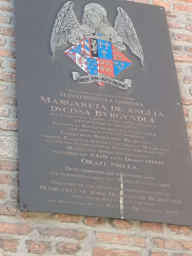 Marguerite a été enterrée dans l’église des Frères Mineurs à Mechelen/Malines en 1503. Sa dépouille mortelle se trouvait devant un autel important, sous une plaque en bronze. Au XVIe siècle, les iconoclastes ont saccagé l’église. Son monument funéraire et la plaque ont disparu. Heureusement il en restait encore un dessin. Plusieurs fouilles ont été exécutés et des ossements de femmes ont été examinés scientifiquement, mais rien de concluant n’est trouvé. Le 21 octobre 2000, au cours d’une cérémonie, l’association internationale des « Ricardians » ont apposé une copie de cette plaque funéraire au mur extérieur du bâtiment (actuellement le Centre Culturel de la ville). Les « Ricardians » veulent restaurer le nom et la réputation suspecte de Richard III, qui a été soupçonné d’avoir fait assassiner ses deux neveux dans la « Tower » à Londres.