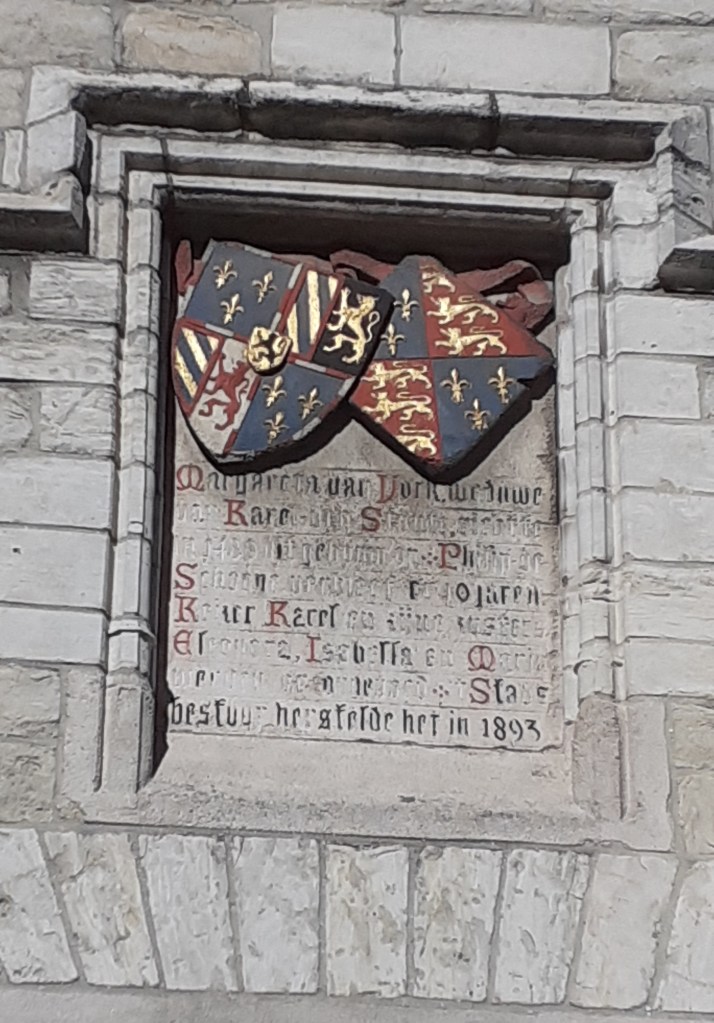 En 1477, quand la veuve Marguerite s’installa à Mechelen/Malines, la partie la plus riche de son douaire, elle acheta la « Cour de Cambrai », ancienne demeure de l’archevêque de Cambrai, Jean de Bourgogne, bâtard du duc Jean Sans Peur, et donc oncle de Charles le Téméraire. Elle dépensa 4.000 florins pour cette résidence qui était entièrement meublée. Selon la volonté de la duchesse douairière, le bâtiment fut beaucoup agrandi et restauré par l’architecte Andries Keldermans, membre d’une dynastie malinoise de renom international en matière de constructions. La ville versa une somme d’argent « pour couvrir les frais ». Trois quarts des bâtiments de cet énorme palais ont disparu au cours des siècles. Seuls une tourelle (avec les écussons de Charles et de Marguerite [voir illustration en tête d’article]) et une aile, côté rue, nous restent aujourd’hui. Elles sont encore assez impressionnantes pour évoquer l’ancienne grandeur de l’édifice. L’aile mentionnée, parallèle à la rue, fut construite à la demande de Marguerite d’York. Elle sert actuellement comme salle de théâtre communale. Il y a des éléments architecturaux qui se réfèrent au Palais Rihour à Lille, par exemple la « grande galerie ». Des années plus tard, Marguerite vendit le tout à Malines pour l’offrir à Philippe le Beau, son beau-petit-fils. La ville embellit le palais qui devint alors le « Prinsenhof », la « Cour des Princes ». Dès 1501, les enfants de Philippe le Beau y résidaient. Ils furent éduqués sous la direction de leur arrière-grand-mère, Marguerite d’York. Après elle, ce fut Marguerite d’Autriche (« Tantine ») qui prit le relais. Vers la fin du XVe siècle, Marguerite d’York estima le palais trop grand pour sa seule personne. Elle se sentait vieillir. Elle acheta quelques maisons de béguines (« maagden ») situées de l’autre côté de la rue. Elle fit transformer ces bâtisses en petit palais par les Keldermans. Il deviendra plus tard le cœur du palais de style renaissance que Marguerite d’Autriche fera construite vers 1525.