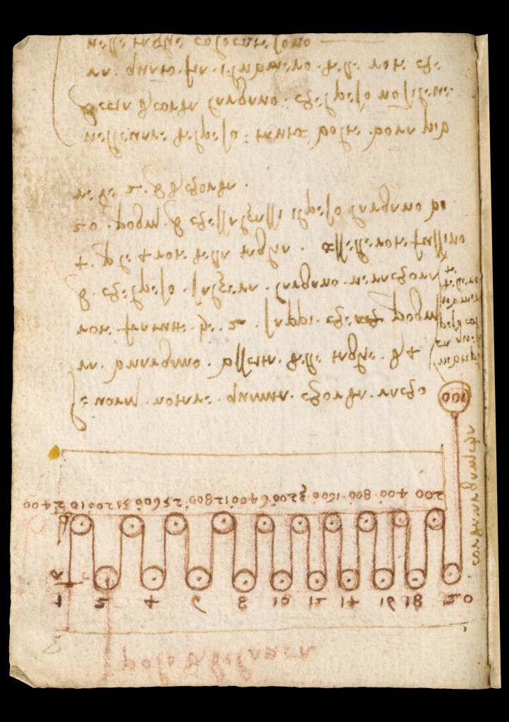 The text and diagrams on f. 86v-87r [see below] form one of several pages of notes on weights, pulleys and motion; specifically ways of quantifying lengths of rope in a twenty wheeled pulley system lifting a 100 pound weight.
