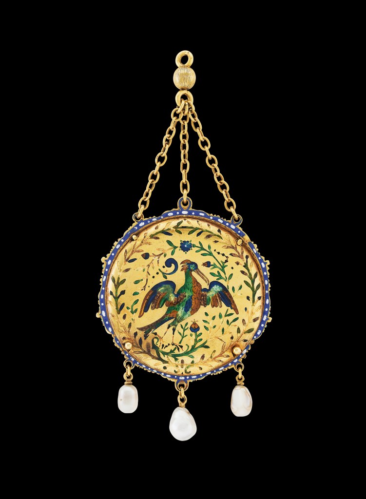This remarkable jewel, exceptional in terms of both complexity and provenance, is composed of a cornelian intaglio featuring at its centre Jupiter astride his eagle, flanked by Mercury and Mars, with Neptune rising from the waves below. The composition is encircled by a frieze with the twelve signs of the zodiac. The stone is mounted in a pendant set with precious stones and enamelled gold fruits, flowers and strapwork; the reverse [see below] features a crane in basse-taille translucent enamel surrounded by flowering tendrils and a laurel wreath on a gold ground. […]