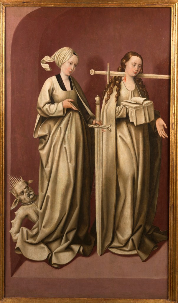 On reconnait ici les deux saintes à qui le commanditaire du retable avait dédié sa chapelle. Lucie, qui tient un livre ouvert, a le cou transpercé d’une épée. Quant à Dymphne, elle s’appuie sur un glaive en écrasant à ses pieds un démon symbolisant le mal.