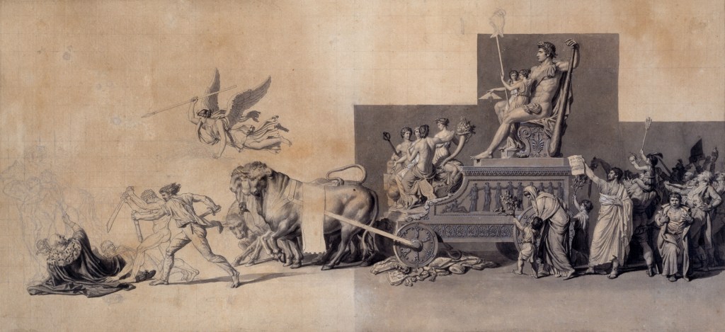 Tenant la Liberté et l’Égalité sur ses genoux, le Peuple français est assis sur un char triomphal. David lui donne les traits d’Hercule, héros réputé pour sa force et sa virilité. À l’arrière, les martyrs de la liberté montrent leurs blessures ou les instruments de leur mort. Devant, deux hommes et une figure ailée fondent sur un tyran jeté à terre. Cette esquisse condense les enjeux politiques et esthétiques de l’année 1794 : il faut avancer sans se retourner sur les débris du monde ancien. L’allégorie illustre le livret de la pièce La Réunion du dix août ou l’Inauguration de la République, présentée comme une « sans-culottide dramatique » le 5 juillet 1794, mais le projet de rideau n’a quant à lui jamais été réalisé.