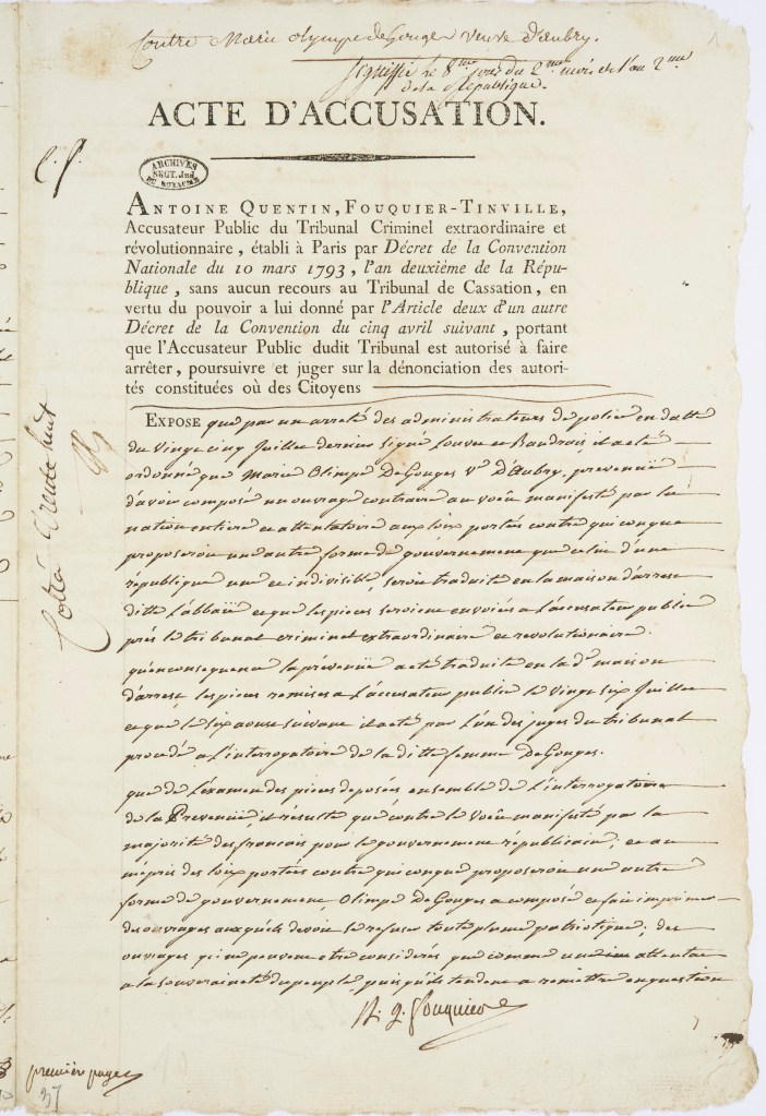 Ces pièces du dossier judiciaire d’Olympe de Gouges témoignent des procédures du Tribunal révolutionnaire. Dans l’interrogatoire mené par le juge Jean Ardouin, elle avoue qu’elle voulait faire passer au président de la Convention nationale son affiche « Les trois urnes ou le salut de la patrie ». Dans celle-ci, elle propose que les citoyens puissent librement choisir leur régime. Cela suffit pour qu’Antoine Fouquier-Tinville réclame la peine de mort. Il l’obtient, comme en témoignent le procès-verbal et l’extrait de jugement.