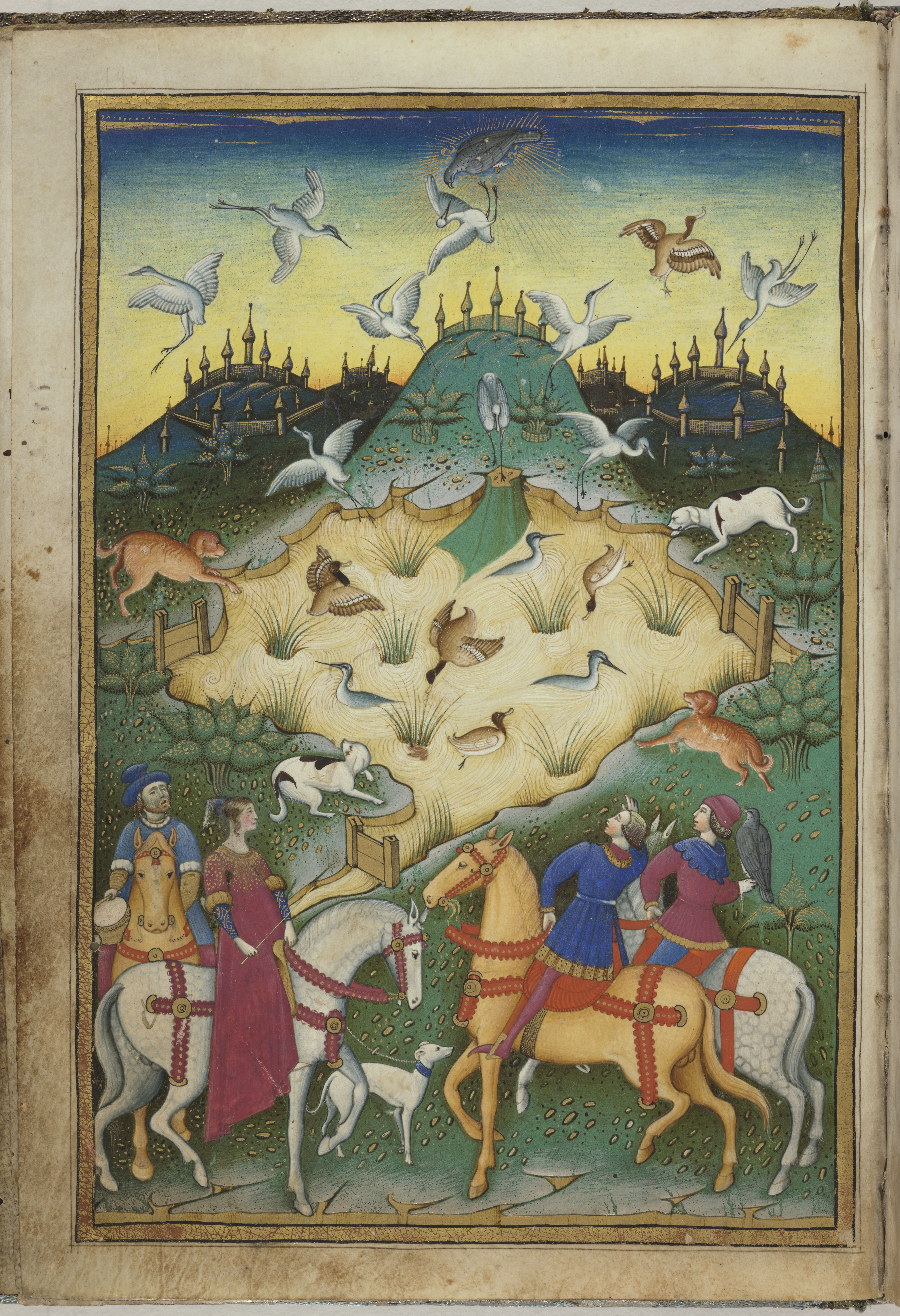 Ce magnifique manuscrit copié par Antonio de Lampugnano et enluminé par le Maître du Traité de fauconnerie, contient plusieurs traités en latin, dont quelques-uns traduits de l’arabe. Ces traités sont consacrés à l’affaitage des faucons et à l’élevage des chiens de chasse. Copié pour Francesco Sforza, duc de Milan (1450-1466), il contient deux miniatures à pleine page, peintes sur des feuillets indépendants. La première montre trois hommes et une femme à cheval participant à une chasse au faucon. Le rapace capturant l’oiseau au-dessus de l’étang est aussi l’emblème ducal.