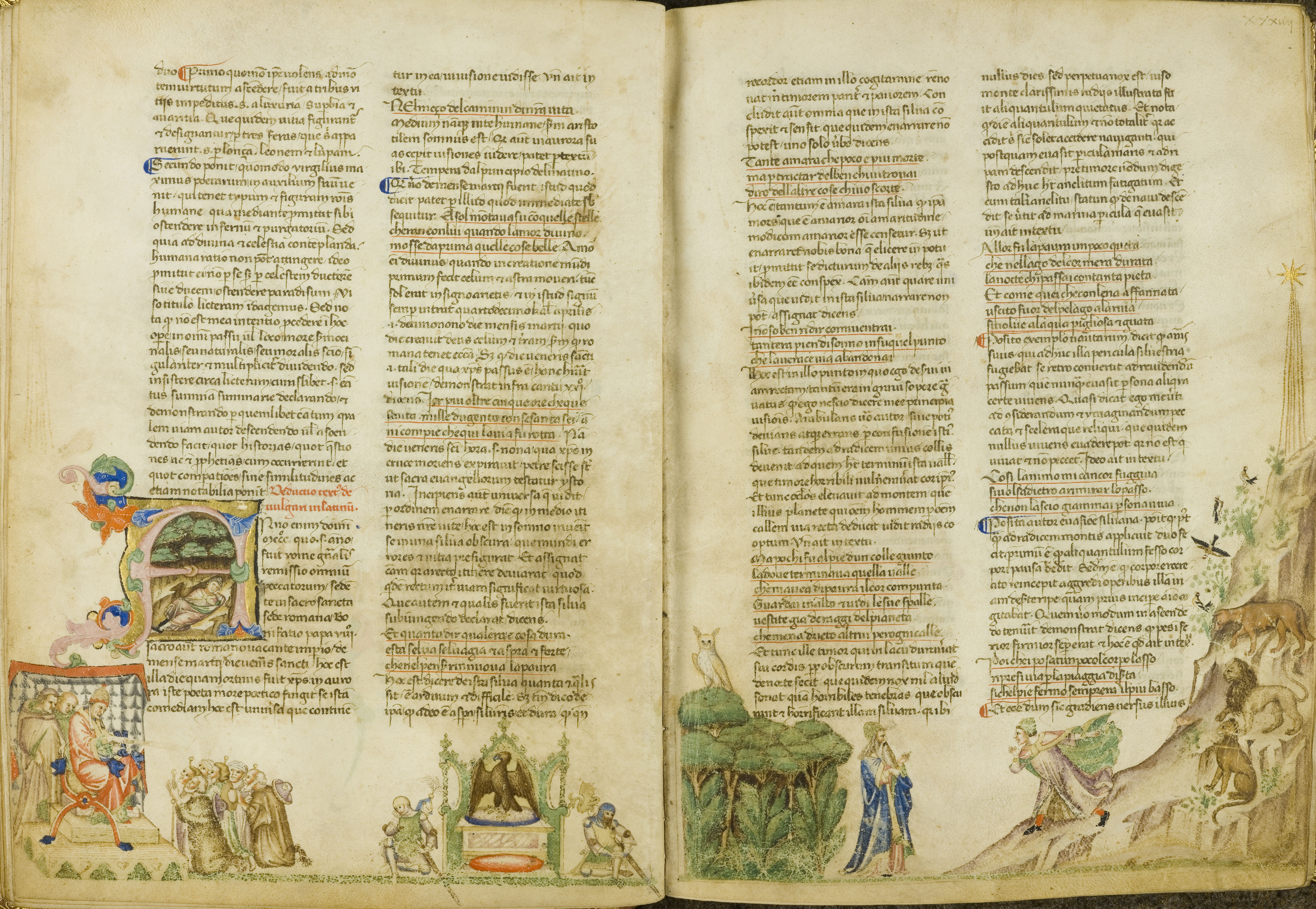 C’est l’auteur du commentaire, le carme Guido de Pise (1321?- 1337?), qui fait sans doute réaliser ce manuscrit à l’intention d’un noble génois : les images accompagnent non le texte de Dante mais le commentaire, constituant ainsi le premier cycle d’illustration connu de cette partie de la Divine Comédie. Les peintures sont attribuées en partie à Francesco Traini, chef de file de la peinture pisane du XIVe siècle. Malgré leur petite dimension, les scènes sont d’une vivacité alors inédite. La nuit du Jeudi au Vendredi Saint de l’an 1300, Dante est perdu dans une forêt. Ainsi s’ouvre la Divine Comédie. Trois fauves, un lynx, un lion et un loup (la luxure, l’orgueil et l’avarice, d’après Guido), empêchent Dante de trouver le droit chemin.