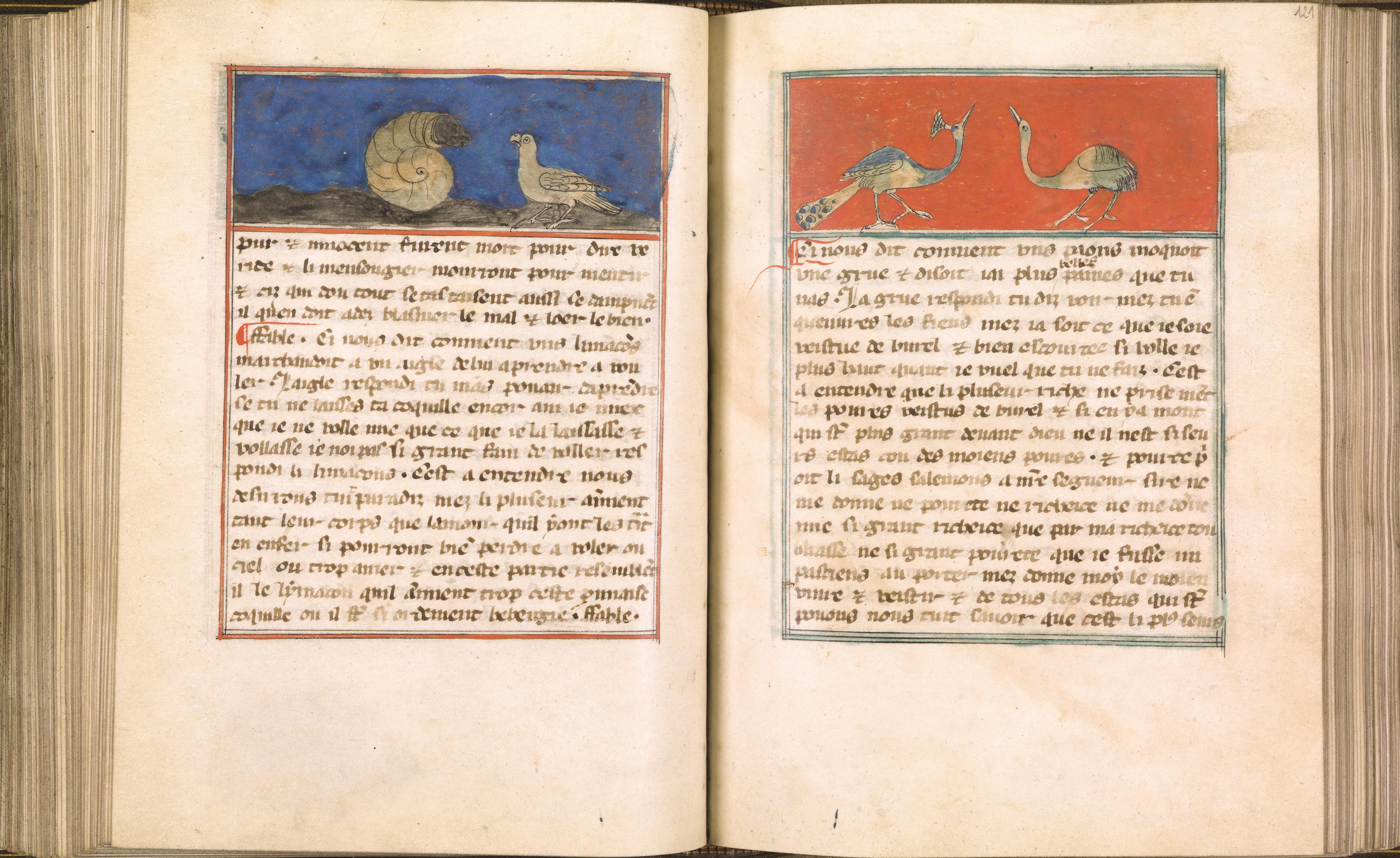 Ce recueil d’instruction chrétienne écrit vers 1320 est constitué de nombreux petits chapitres, ou exempla, classés de la Genèse au Jugement Dernier. Il puise des éléments dans la Bible, les vies des saints, les bestiaires, les fables… Chaque chapitre commence par la formule « Ci nous dit » (Ici on nous dit que…) qui finit par désigner l’œuvre. Destiné à un laïc, ce manuscrit exceptionnel par son décor est le plus ancien des Ci nous dit. La Fable de l’aigle et de l’escargot (f. 118v) qui préfère garder sa coquille plutôt que de voler (Chapitre 186 du Ci nous dit) raconte comment un escargot demande à un aigle de lui apprendre à voler. Mais lorsque l’aigle lui dit que pour cela il doit abandonner sa coquille, l’escargot préfère ne pas savoir voler. Moralité : beaucoup d’hommes renonceront à voler jusqu’au paradis à cause du trop grand amour de leur corps, car ils aiment trop cette « coquille puante » où ils sont mal logés.