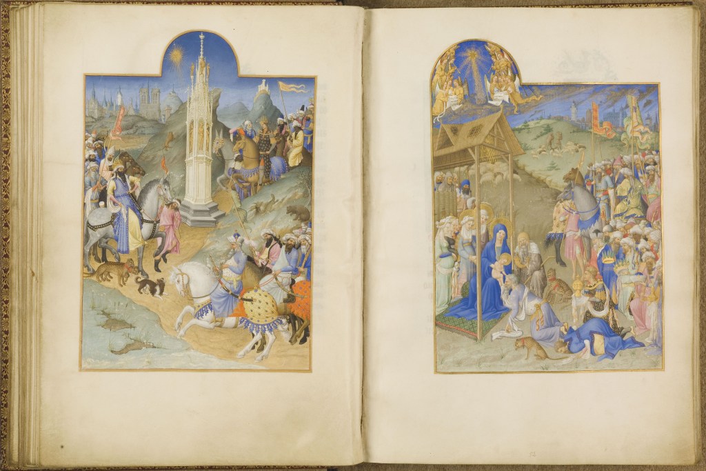 Dans les Très Riches Heures, l’office de sexte des Heures de la Vierge, récité vers midi, est précédé par un diptyque qui a pour thème l’histoire des Rois mages et qui met en scène un bestiaire exotique. Seul l’évangéliste Mathieu évoque trois mages venus d’Orient pour adorer l’Enfant Jésus et reconnaître ainsi la nature divine du Christ. Sous la plume des auteurs tardo-antiques et médiévaux, les mages deviennent des rois d’origine lointaine. Félins et camélidés accompagnent donc le cortège des trois Rois lors de leur rencontre au pied d’une montjoie (à gauche) ou lors de la scène de l’adoration (à droite). Les frères Limbourg ont pu observer ces animaux sur le vif dans la ménagerie que le duc de Berry possédait, et qui était, à l’instar de sa bibliothèque, un des symboles de son prestige et de son rang.