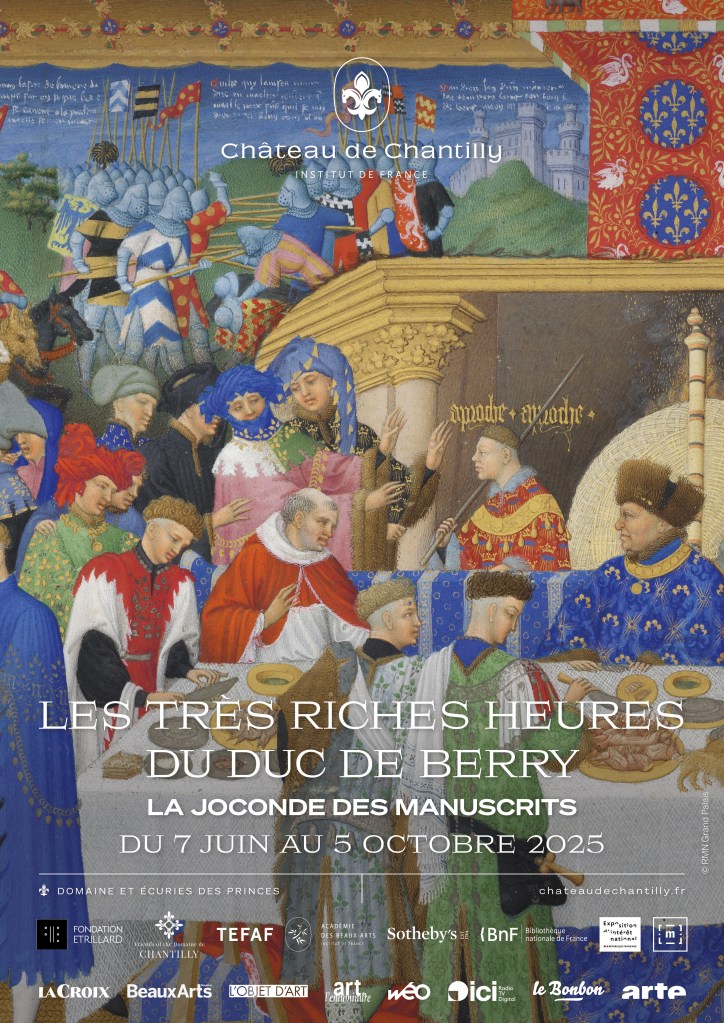Véritable icône du Moyen Âge, les Très Riches Heures du duc de Berry sont le joyau des collections du musée Condé de Chantilly. Conformément aux volontés de son donateur, le duc d’Aumale, le manuscrit ne peut être exposé en dehors du musée Condé où, du fait de sa fragilité et de sa préciosité, il est habituellement conservé à l’abri des regards, en lieu sûr. Souffrant de plusieurs désordres, le manuscrit devait être restauré. Cette restauration, précédée par des mois d’analyses scientifiques et d’études préalables, permet de montrer, pour la première fois et sans doute la dernière, 26 pages en même temps : celles du mythique calendrier. L’exposition qui accompagne ce véritable événement vient replacer ce « livre-cathédrale » dans son contexte et donner à voir son incroyable influence. Commandé vers 1411 par l’immense collectionneur et bibliophile Jean, duc de Berry, à trois enlumineurs de génie, les frères de Limbourg, il reste inachevé à la mort de tous ces protagonistes, en 1416. Tout au long du siècle, d’autres enlumineurs se succèdent pour le compléter, tels Barthélémy d’Eyck vers 1446 pour la famille royale, et Jean Colombe vers 1485 pour Charles Ier de Savoie qui en hérite à son tour. À partir de son installation à Chantilly et des premières reproductions initiées par le duc d’Aumale, le livre acquiert une célébrité mondiale qui lui confère une valeur d’icône. Il façonne encore aujourd’hui une vision poétique et idéale du Moyen Âge dans l’imaginaire collectif.
