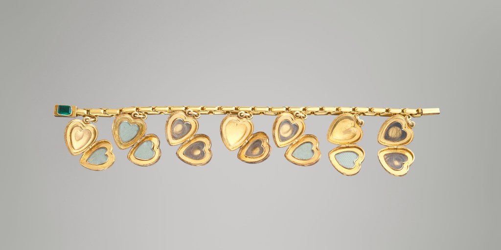 Ces bijoux étaient par excellence des cadeaux échangés entre princesses romantiques. La reine Victoria en usa largement, comme en témoigne un second bracelet récemment entré dans les collections du musée Condé. La date apposée sur le fermoir permet de retrouver le contexte de sa création. Le 3 avril 1844, Louise était en effet à Buckingham Palace pour son 32e anniversaire : « Ce matin, dès 8h1/2, le Leopich a eu la bonté de venir me souhaiter ma triste fête, et m’a dit des choses qui m’ont bien touché ; nous avons ensuite déjeuné avec Victoria qui a été bien bonne aussi et bien comprenant tous mes sentiments. Elle m’a donné un charmant bracelet avec des cœurs pour mettre des cheveux de toute la famille. » (Louise à Marie-Amélie).