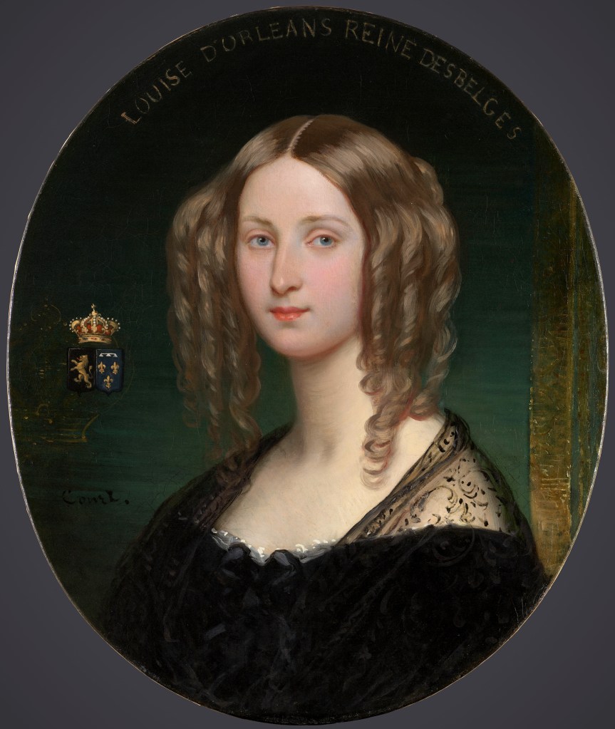 Peintre d’histoire et portraitiste, le Normand Joseph-Désiré Court, artiste officiel de la monarchie de Juillet, était doté d’un talent certain pour le portrait. Il semblait alors naturel, comme le confirme la remarque agacée de Louise à sa mère dans une lettre datée du 29 septembre 1833, que l’artiste sollicita le patronage du nouveau couple royal. Court avait en effet été chargé de peindre le premier mariage royal belge, pour Compiègne d’abord, en 1833, puis pour Versailles, quatre ans plus tard. C’est dans le cadre de la commande de 1833 que doit être compris l’un des tout premiers portraits de la reine, aujourd’hui conservé au musée Condé (venant de la collection de son frère, le duc d’Aumale) présentant les armes jointes Orléans et Belgique aux côtés d’une princesse juvénile, figurée en buste. Il s’agit néanmoins d’un portrait intime, sans doute réservé à la sphère familiale.