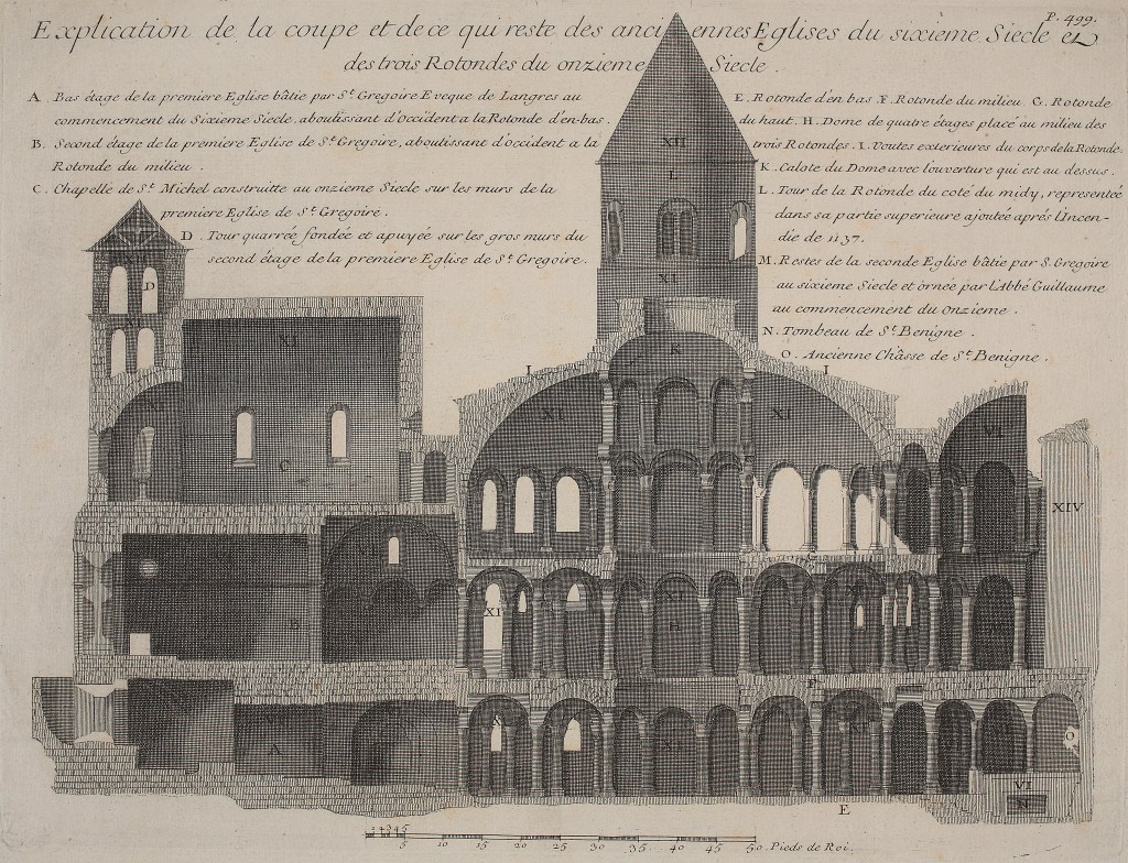 À partir de l’an mille, la construction de nouvelles églises est favorisée en Bourgogne par une économie florissante et le mouvement de réforme clunisienne des monastères. Guillaume de Volpiano, venu à Dijon pour redresser l’abbaye Saint-Bénigne, s’empare du projet de construction d’une nouvelle église pour mieux protéger et valoriser le tombeau de saint Bénigne et le modifie considérablement. La nouvelle abbatiale est construite sur les fondations de l’ancienne, mais elle est plus large et plus longue. Elle est formée d’une grande église dont le chœur s’ouvre sur une rotonde, elle-même poursuivie par une chapelle axiale, qui en font une œuvre architecturale particulièrement remarquable. Le moine chroniqueur Raoul Glaber (v. 985 – v. 1047) la décrit comme la « plus admirable des basiliques de toutes les Gaules et de proportions incomparables ». Cette coupe est une restitution de l’articulation de la rotonde avec les bâtiments qui lui sont liés au XIe siècle. À gauche, les trois niveaux de la rotonde communiquent avec les trois niveaux de la chapelle axiale, en montant quelques marches pour le deuxième niveau et par deux volées de marches pour le troisième. À droite est représentée son articulation avec l’église du XIe siècle, dont seule l’extrémité orientale apparaît sur la coupe. Le premier niveau de la rotonde communique avec les cryptes de l’église où est placé le tombeau de saint Bénigne. Le deuxième niveau communique quant à lui avec le chœur de l’église. Le troisième niveau de la rotonde ne dispose pas d’un niveau de circulation avec le corps de l’église, mais il est ouvert sur son abside. Au centre de la rotonde, en hauteur, s’ouvre l’oculus, derrière lequel est visible la tour de l’escalier sud. À la suite de l’effondrement d’une tour en 1271, l’église romane est détruite pour être remplacée par une nouvelle église bâtie dans le style gothique. La rotonde et sa chapelle axiale sont conservées, mais en grande partie dissociées de l’édifice gothique.