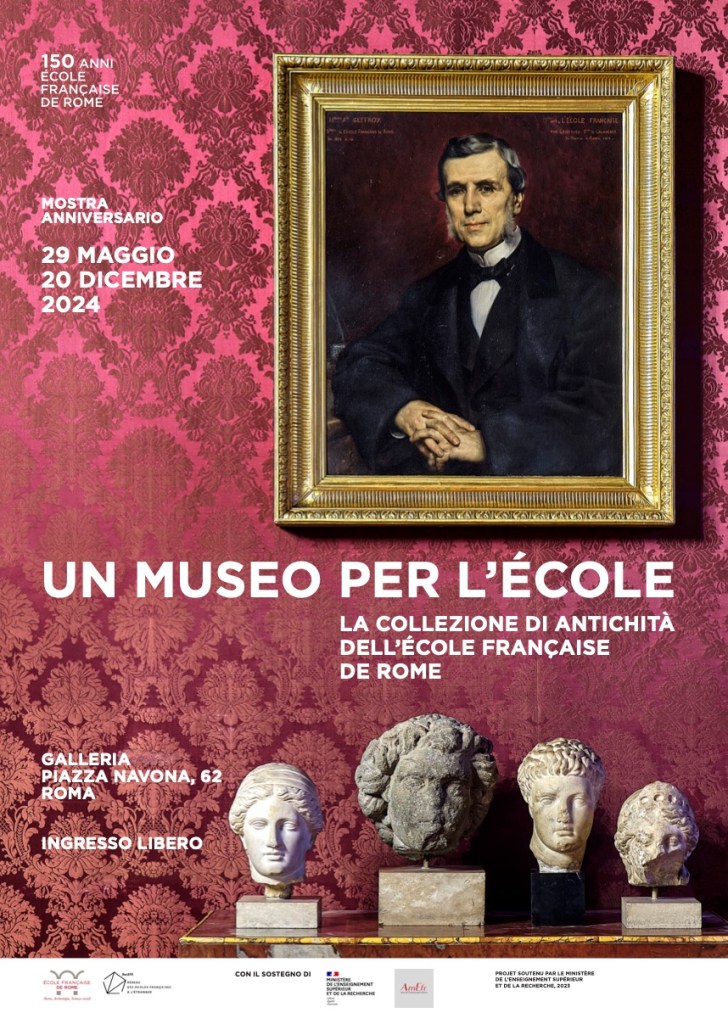 Nell’ambito delle celebrazioni per il 150° anniversario dell’École française de Rome, si terrà la mostra intitolata « Un museo per l’École: la collezione di antichità dell’École française de Rome », ospitatanegli spazi espositivi della Galleria in Piazza Navona 62, sede dell’École. L’esposizione, curata dagli archeologi Christian Mazet e Paolo Tomassini, sarà aperta al pubblico dal 29 maggio al 20 dicembre 2024. La collezione presenta una gamma rappresentativa, esposta per la prima volta, di circa 200 reperti: sculture, terrecotte etrusco-laziali, vasi greci ed etruschi, oltre a documenti provenienti dagli archivi dell’École française de Rome e dagli inventari degli arredi di Palazzo Farnese.