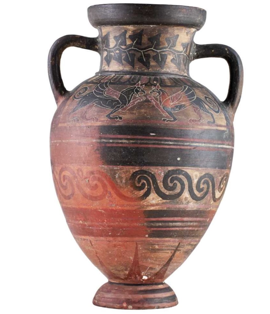L’anfora, donata all’École française de Rome nel 1879 dal mercante romano Augusto Castellani (1828-1914), si pensa sia stata rinvenuta nella necropoli di Cerveteri. Realizzata con la tecnica a figure nere in argilla bruna chiara, è stata realizzata in Etruria nella seconda metà del VI secolo a.C. La produzione può essere attribuita al Gruppo della Tolfa, una bottega di pittori che prese il nome dall’area geografica in cui fu rinvenuto uno dei primi vasi identificabili del loro corpus: i Monti della Tolfa, una catena montuosa al confine tra i territori delle città marinare di Cerveteri e Tarquinia. Il collo del vaso è decorato con un fregio di edera. Alla giunzione tra il collo e la spalla, dopo l’anello plastico, un fregio di lingue rosse e nere alternate introduce la scena figurata, identica su entrambi i lati del vaso: lo scontro tra due grifoni, creature ibride alate con il corpo di aquile e leoni. Il pittore ha utilizzato una sovradipintura rossa per evidenziare le piume interne delle ali, le zampe più arretrate nella composizione, creando un effetto di profondità, così come le lingue pendenti e le orecchie di cavallo. Il corpo è decorato con due larghe fasce di smalto nero, sottolineate da tre linee, che incorniciano un fregio di motivi ad onda, punteggiato da motivi a petali in bianco sovradipinto. La base del corpo è decorata con bordi a raggiera e presenta un restauro moderno in gesso alla giunzione tra il corpo del vaso e il piede, a sua volta molto probabilmente restaurato e poi ridipinto. Come in diversi esempi di anfore del gruppo di Tolfa, il vaso presenta un’ampia traccia di fuoco su gran parte del corpo.